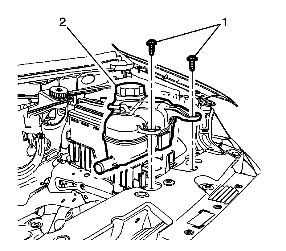 29. Remove the radiator surge tank (2) and position aside. Refer to Radiator Surge Tank Replacement Radiator Surge Tank Replacement.