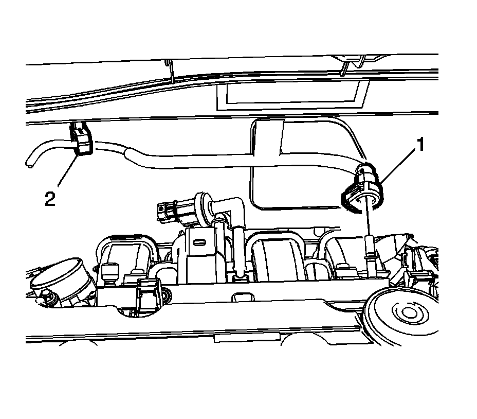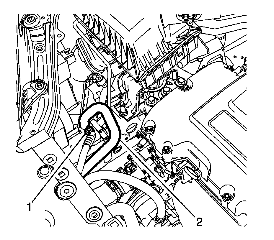 34. Connect the heater inlet hose (2) from the heater core. Refer to Heater Inlet Hose Replacement (LDE, LUW) Heater Inlet Hose Replacement (LDE, LUW)Heater Inlet Hose Replacement (LUV) .