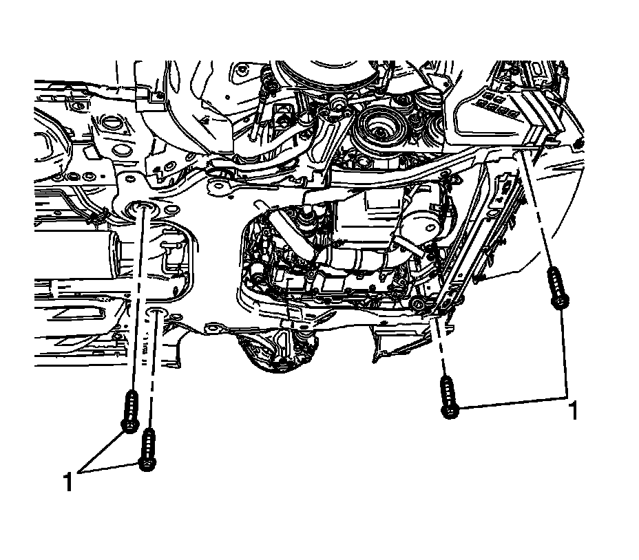 44. Remove and DISCARD the transmission mount bolts (1) - left side. Refer to Transmission Mount Replacement - Left Side Transmission Mount Replacement - Left Side.