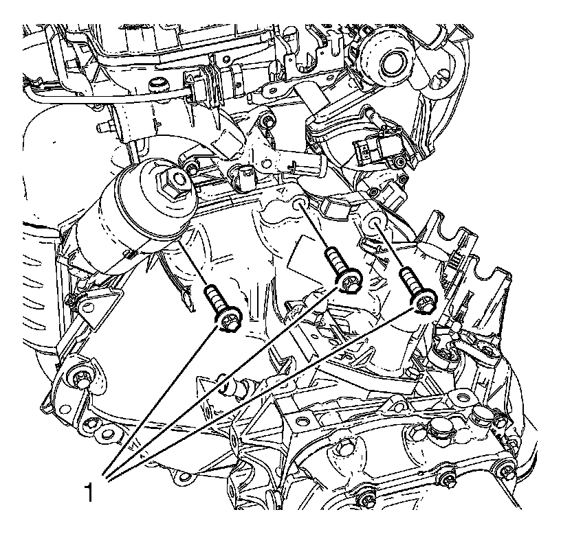 4. If equipped with an automatic transmission, install the torque converter to flex plate bolts (1) and tighten to 60 Nm (44 lb ft).