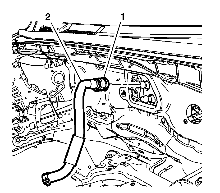 35. Connect the heater outlet hose (2) from the heater core. Refer to Heater Outlet Hose Replacement (LUV) Heater Outlet Hose Replacement (LDE, LUW) Heater Outlet Hose Replacement (LDE, LUW).