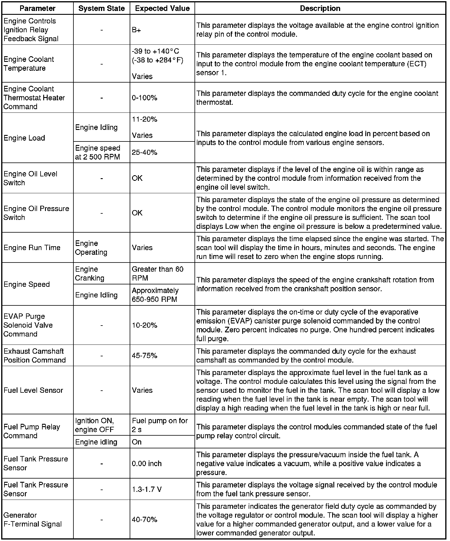 The Engine Control Module Scan Tool Data List contains all engine related parameters that are available on the scan tool. The list is arranged in alphabetical order. A given parameter may appear in any one of the data lists, and in some cases may appear more than once, or in more than one data list in order to group certain related parameters together.