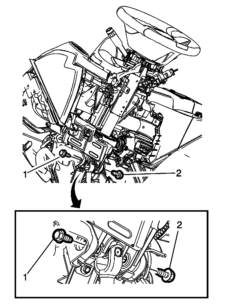 10. Remove the 2 steering column lower support bracket bolts (1, 2).