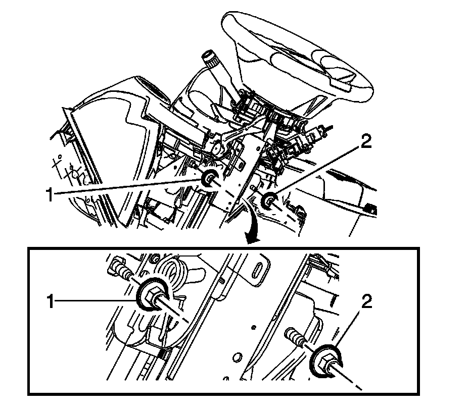 11. Remove the 2 steering column upper support bracket nuts (1, 2).
