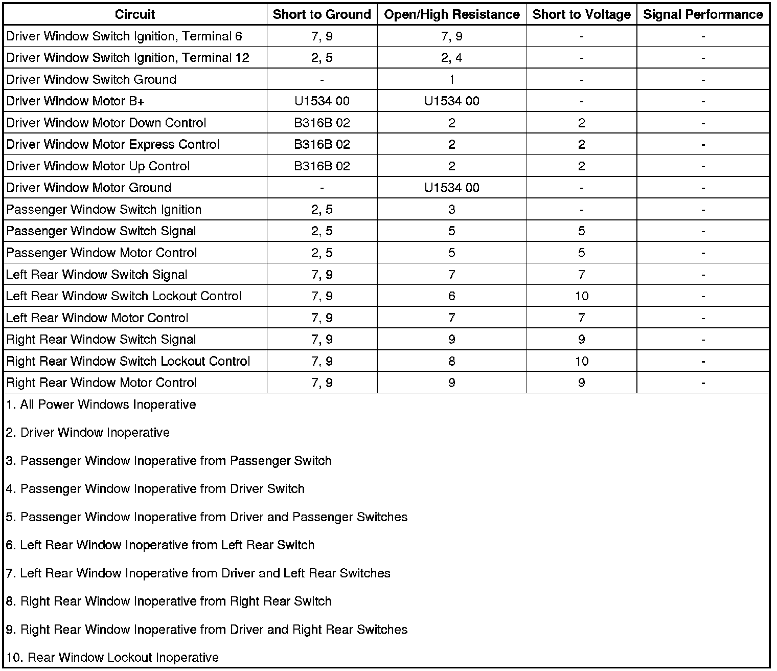 • If the passenger window functions from the driver window switch but not from the passenger window switch, refer to Passenger Window Switch Malfunction.