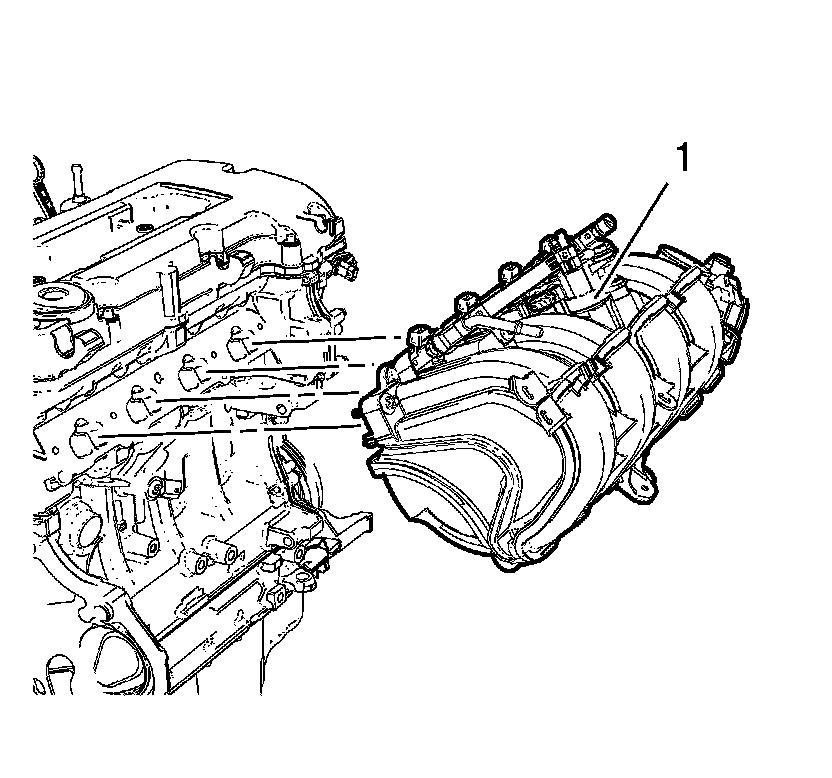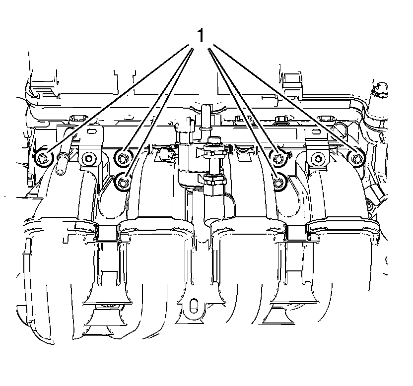 3. Install the 6 intake manifold bolts (1) and tighten to 20 Nm (15 lb ft).