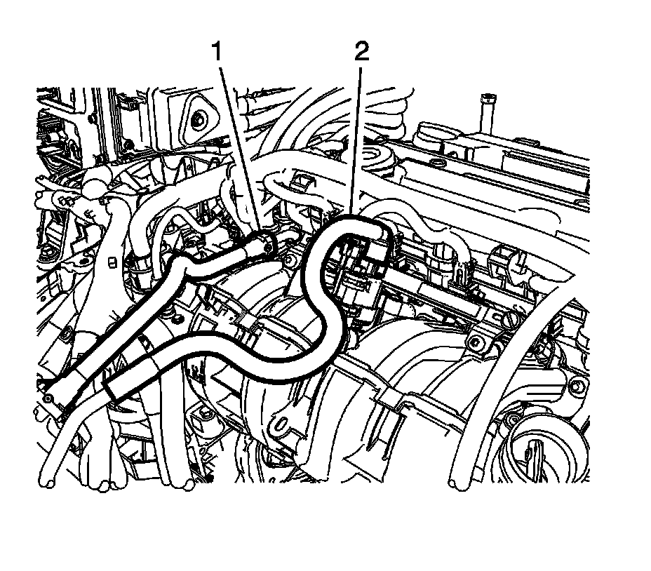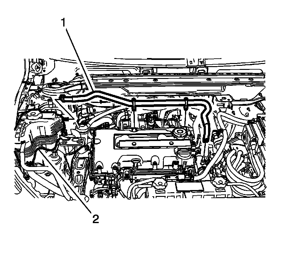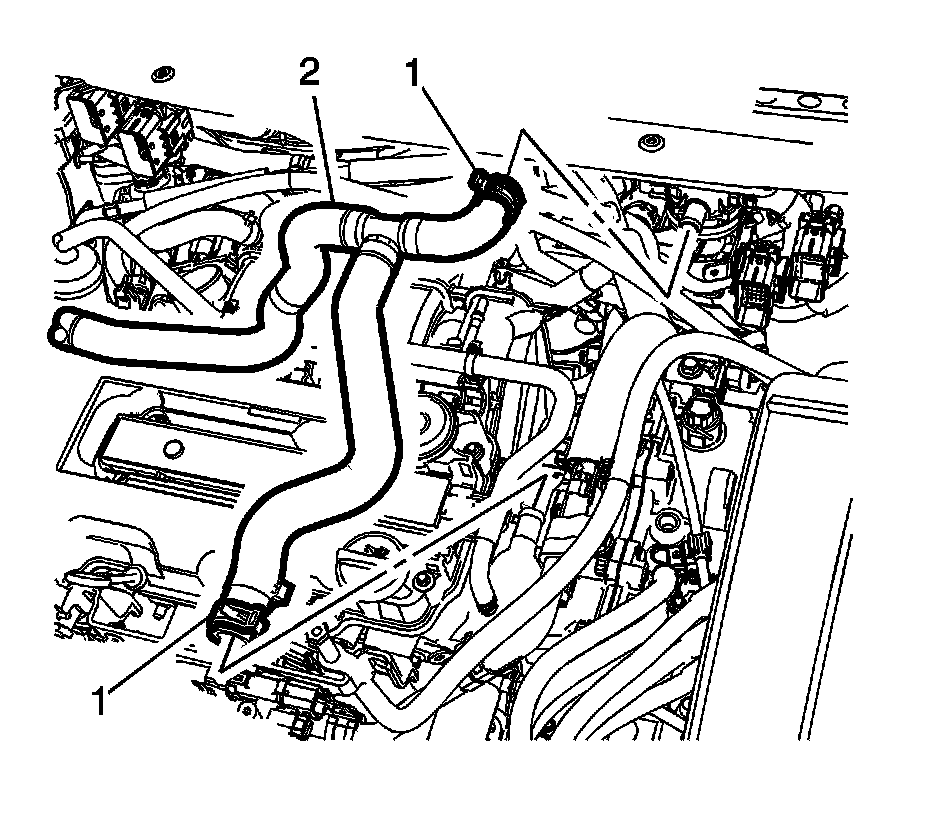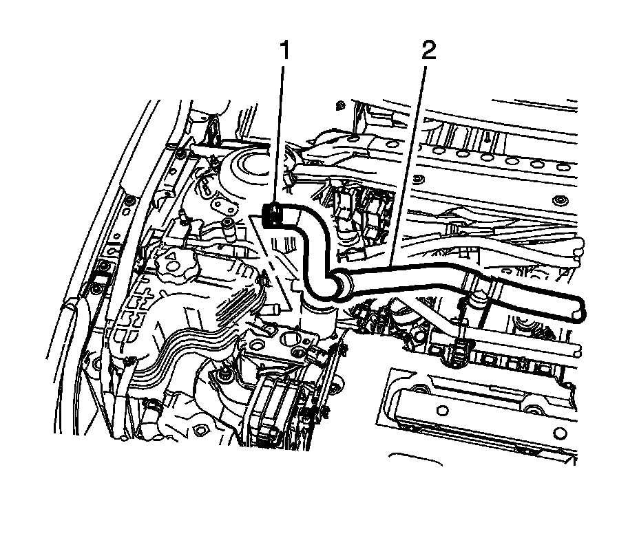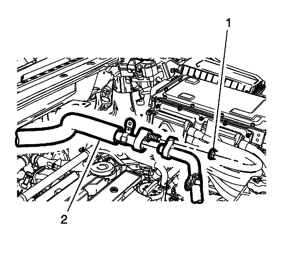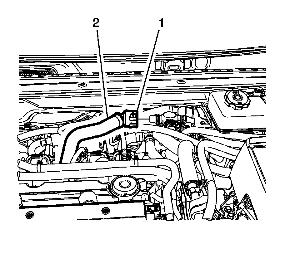 16. Disconnect the heater outlet hose vapor vent hose (1) from the coolant reservoir (2). Refer to Heater Outlet Hose Vapor Vent Hose Replacement Heater Outlet Hose Vapor Vent Hose Replacement.