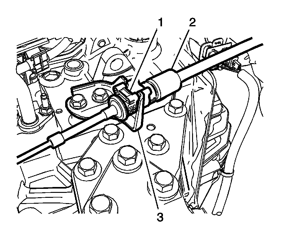 10. Press the locking tab (1) rearward in order to release the transmission range selector lever cable (2) from the cable bracket.