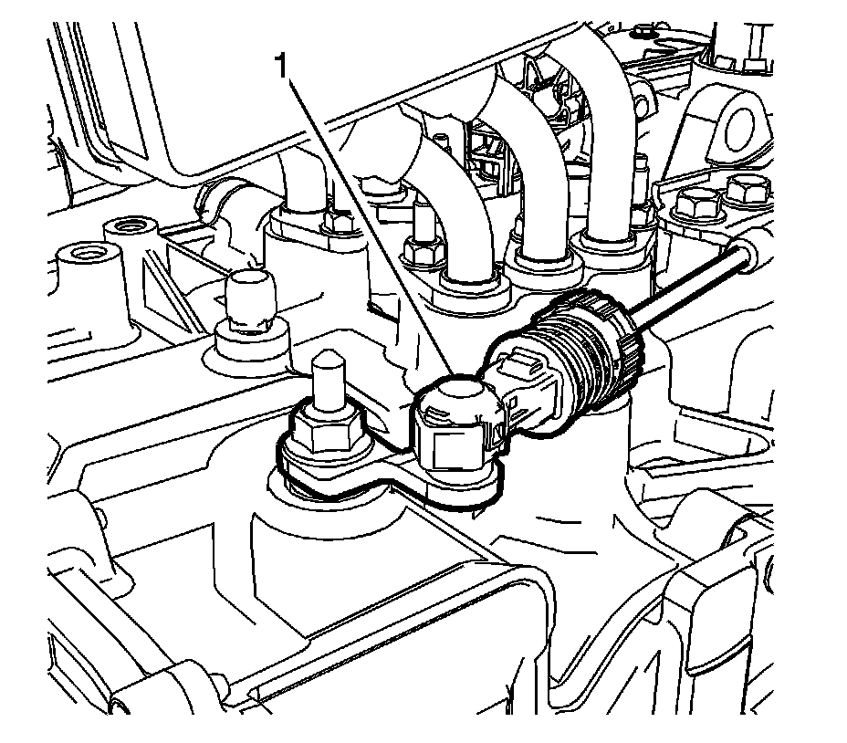 9. Disconnect the fuel feed pipe (1) from the fuel rail assembly. Refer to Fuel Feed Pipe Replacement (Engine Compartment) Fuel Feed Pipe Replacement (Engine Compartment)Fuel Feed Pipe Replacement (Chassis) Fuel Feed Pipe Replacement (Chassis).