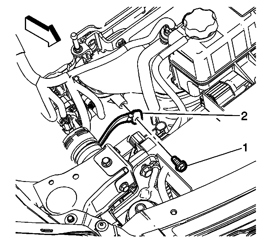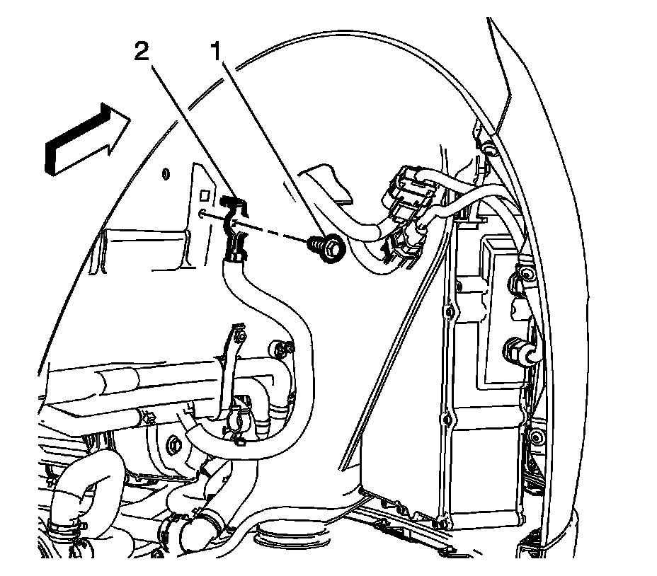 2. Remove the engine ground strap bolt (1) and terminal (2), from the wheelhouse panel.