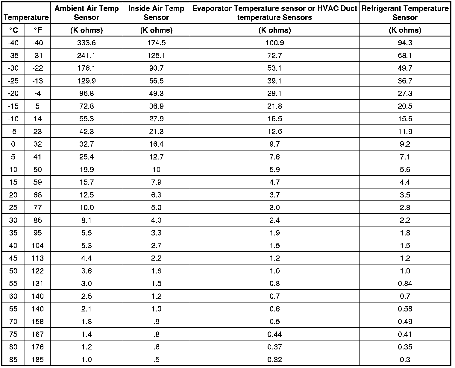 Sensor Resistance Table