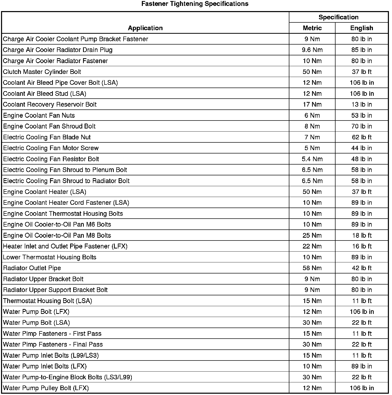 Fastener Tightening Specifications