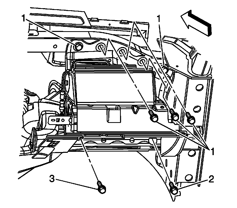 9. Remove the bolts (3) retaining the knee bolster bracket to the center support bracket.