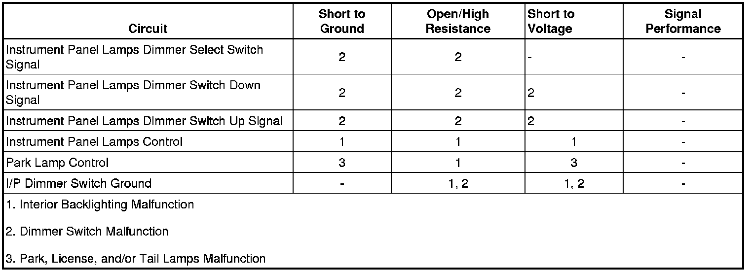 The instrument panel cluster (IPC) receives an input from the I/P dimmer switch. The IPC provides the I/P dimmer switch with battery positive voltage and ground. The I/P dimmer switch is a potentiometer that varies the input signal voltage to the IPC. This input determines the intensity level of the backlighting illumination. The driver may change intensity of the backlighting by positioning the I/P dimmer switch between the minimum and maximum settings. The IPC will default to full intensity if the input from the I/P dimmer switch is not within the specified values. The backlighting illumination intensity is controlled by the IPC by varying the pulse width modulation (PWM) voltage that feeds the dimming signal circuits of the individual lamps. All interior backlighting lamps are permanently grounded.