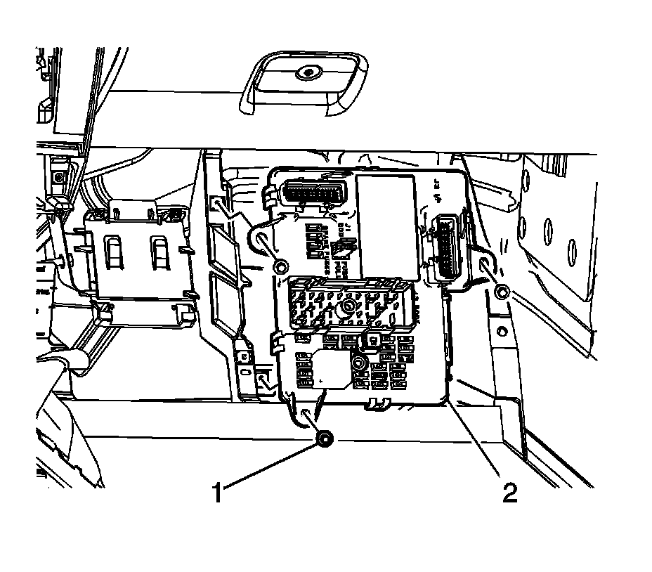 3. Remove 3 retaining screws (1) which secure the body control module (BCM) (2) to the multiuse bracket.