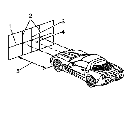 11. Measure the distance between the centerline of the right headlamp capsule lens and the center of the left headlamp capsule lens (5). Position the vertical tapes on the aiming screen (2) this distance to the right and left of the screen centerline.