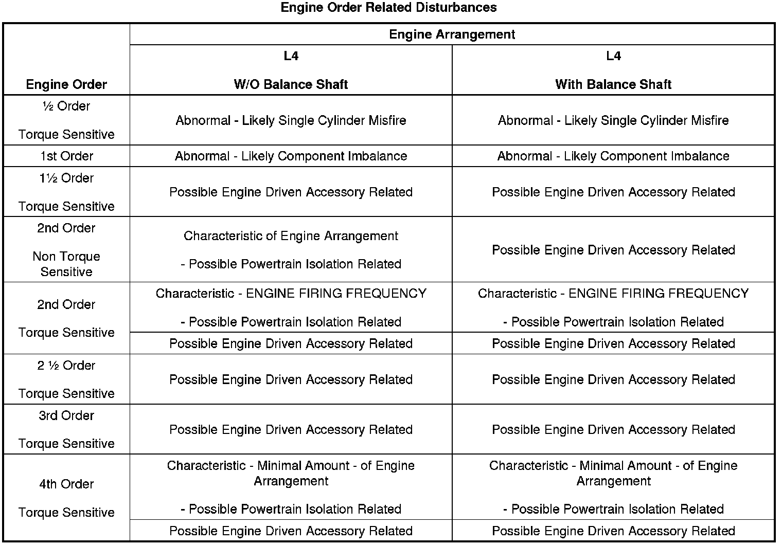 3. If the dominant frequency in Hz, recorded during duplication of the disturbance and the engine firing frequency in Hz, just calculated ARE related, then an engine FIRING FREQUENCY related disturbance is present. Engine firing frequency disturbances are usually related to improper isolation of a component. Refer to the Engine Order Related Disturbances table.