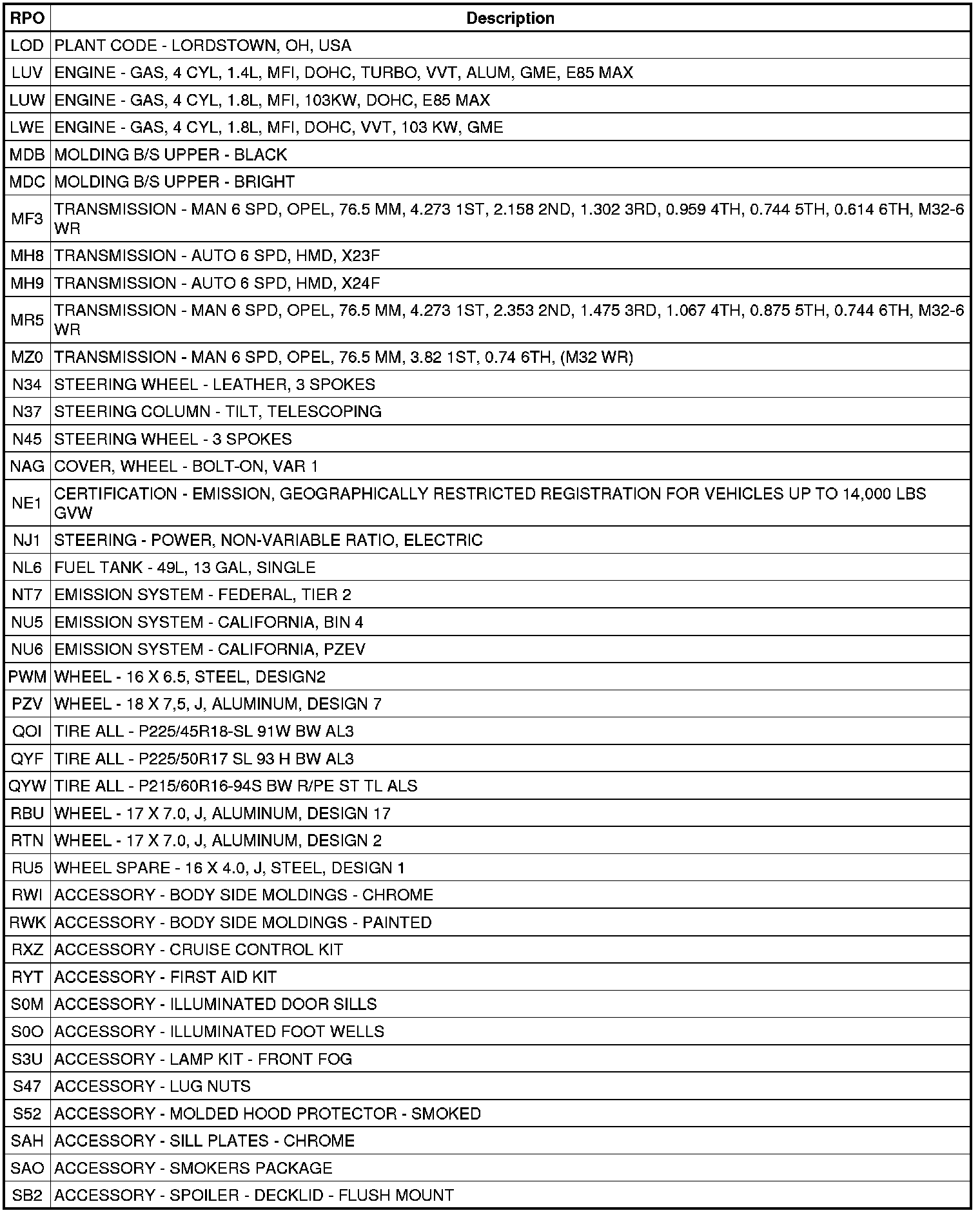 The following table provides the description of the Regular Production Option (RPO) codes that are available on the vehicle. The vehicle's RPO list is printed on the Service Parts Identification Label.