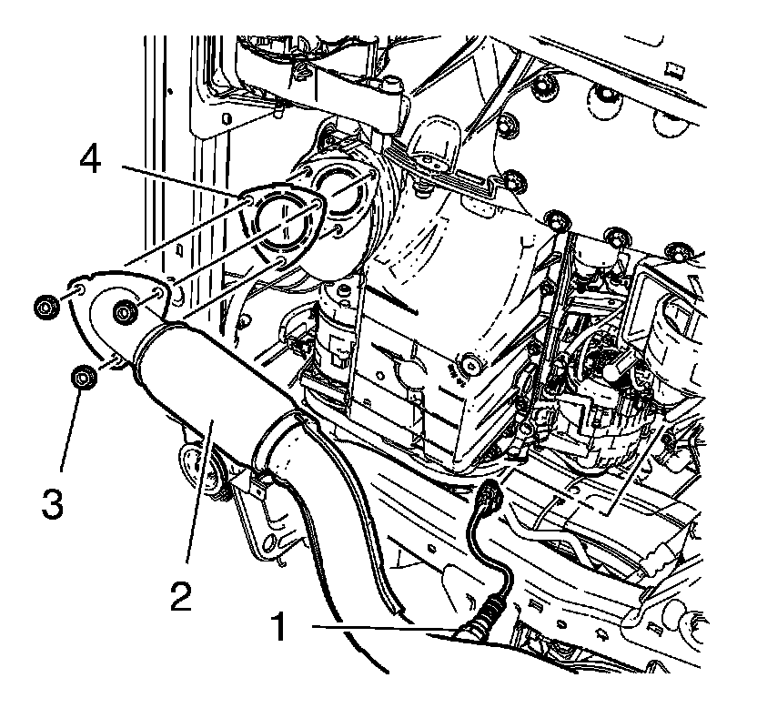 7. Install the 2 exhaust pipe front hanger bracket insulator nuts (3) and tighten to 17 Nm (13 lb ft).