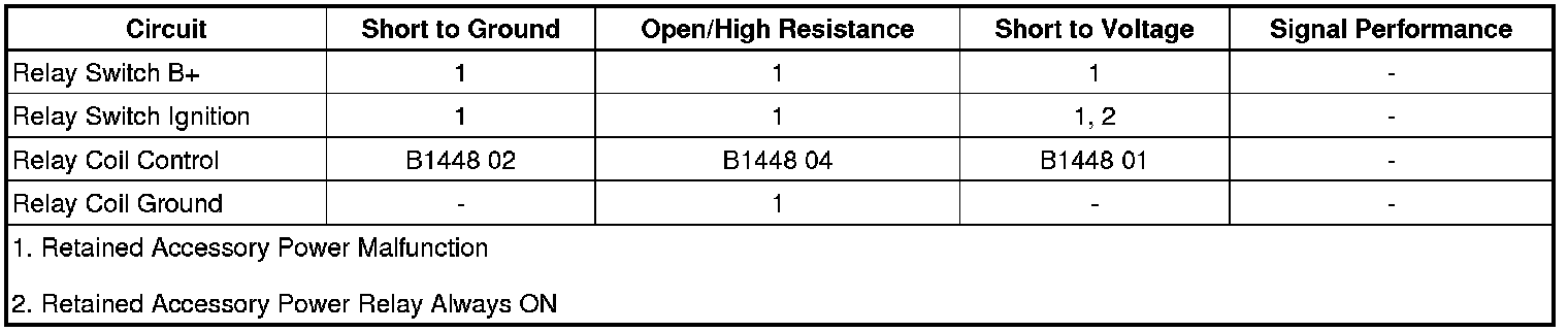 The body control module (BCM) controls the retained accessory power relay through the control circuit by applying voltage to the retained accessory power relay coil control circuit. The retained accessory power relay is energized when the ignition switch is in the ACCESSORY or the ON position.