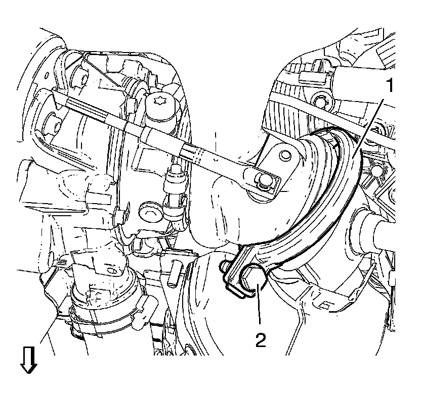 5. Loosen the three way warm up catalytic converter V-clamp bolt (2) so that the three way warm up catalytic converter V-clamp (1) can be removed from catalytic converter to turbocharger flange.