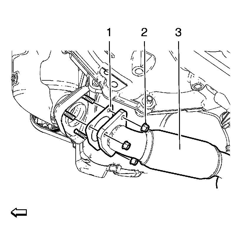 11. Install the catalytic converter (3) and a NEW catalytic converter gasket (1) to the three way warm up catalytic converter.