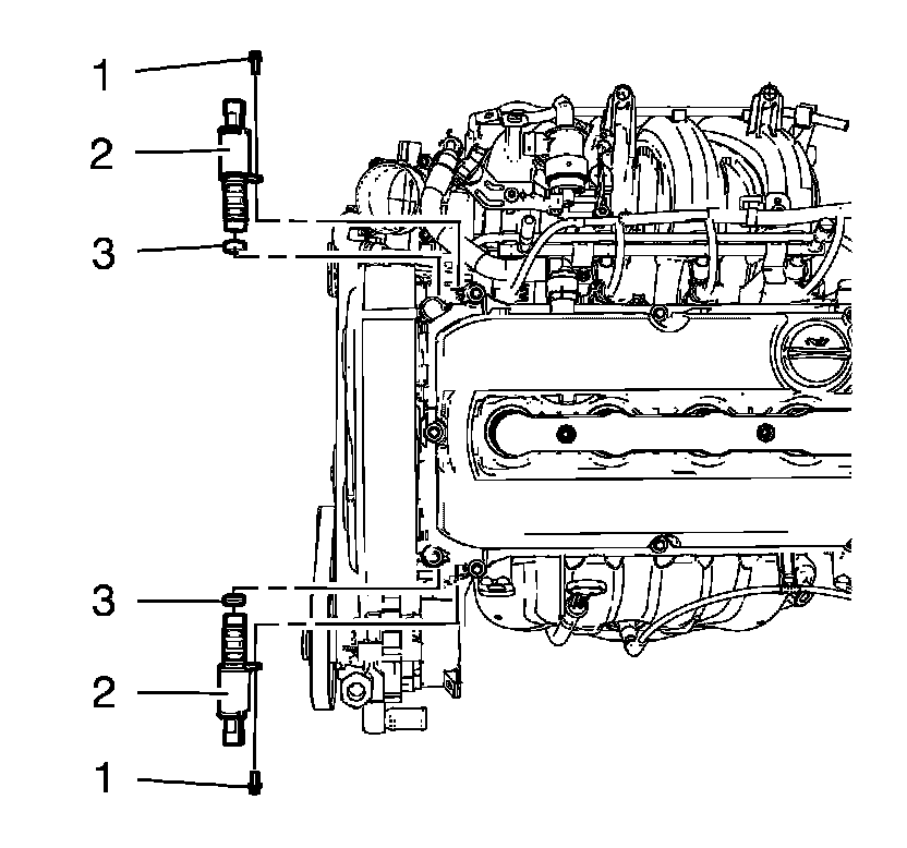 Install the camshaft position actuator solenoid valve bolts (1) and tighten to 6 Nm (53 lb in).