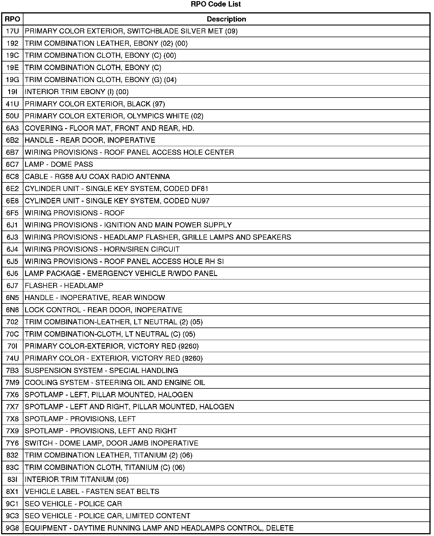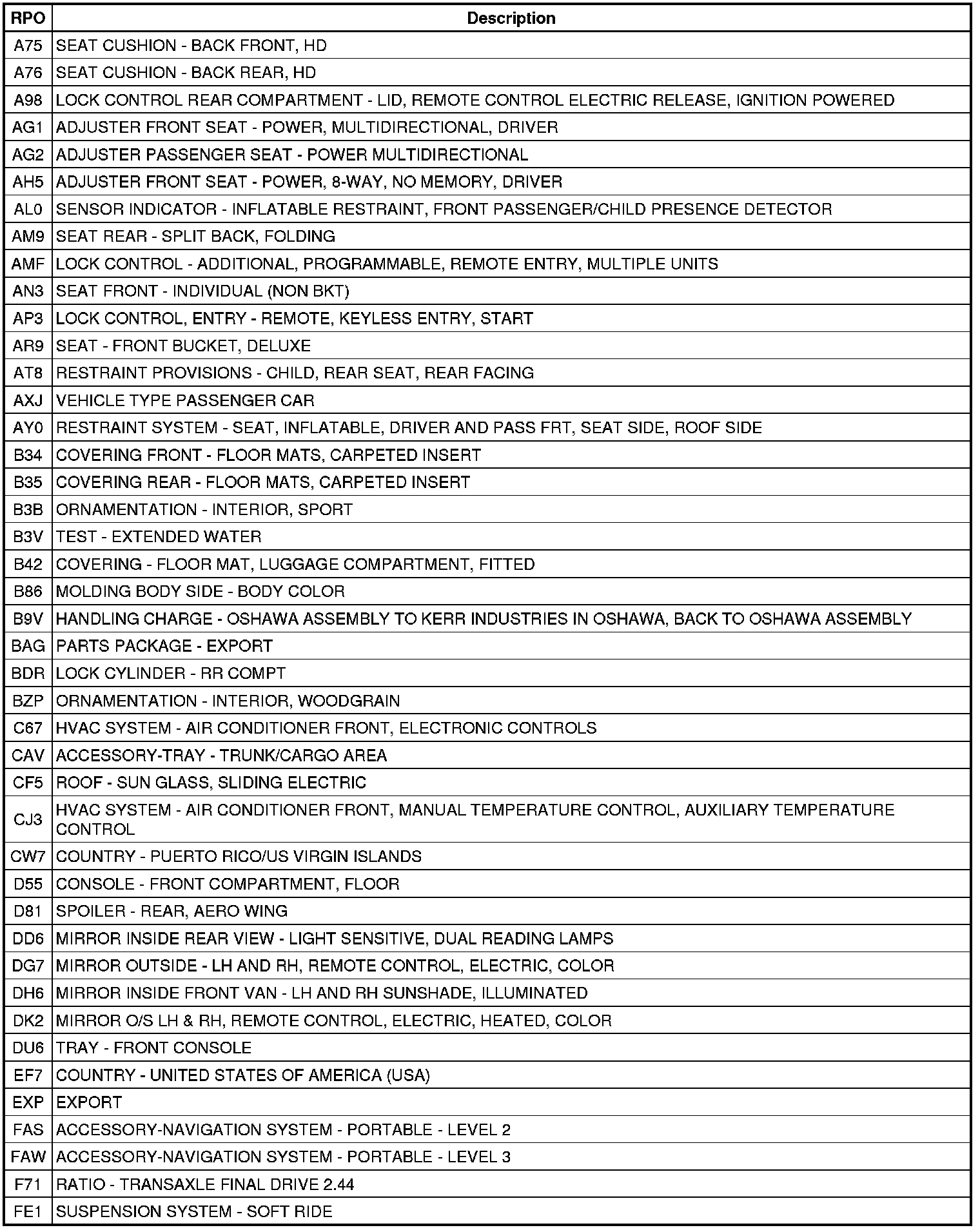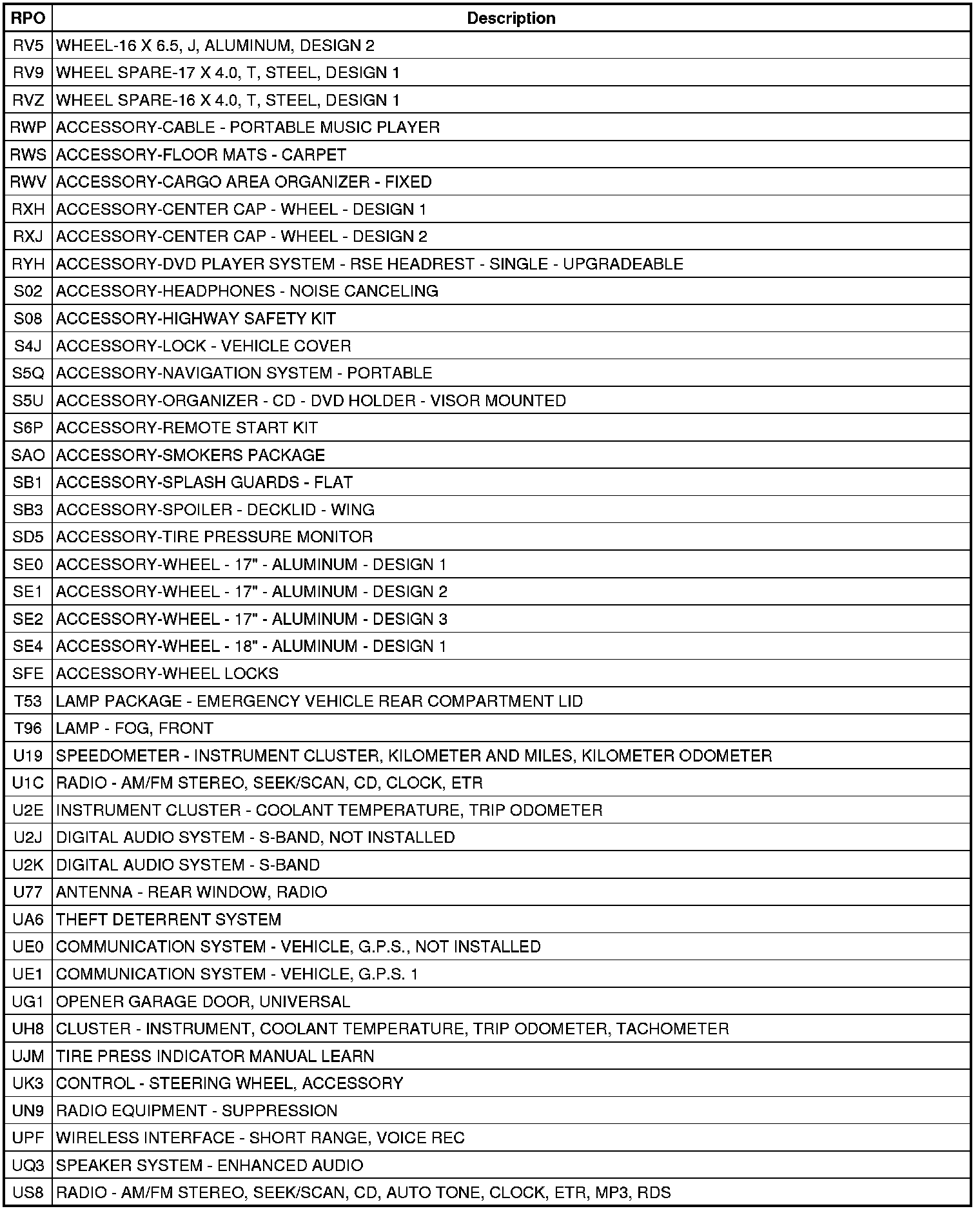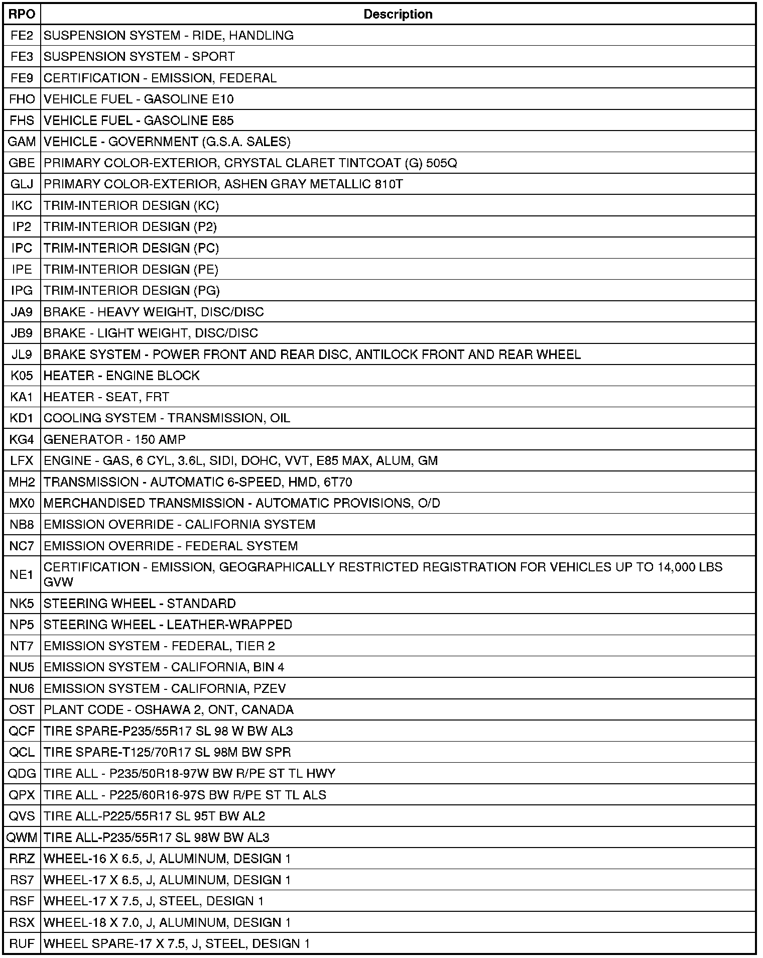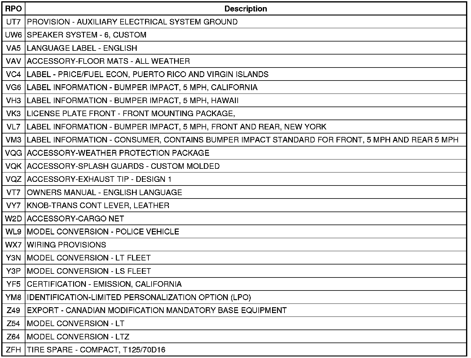 The following table provides the description of the Regular Production Option (RPO) codes that are available on the vehicle. The vehicle's RPO list is printed on the Service Parts Identification Label.