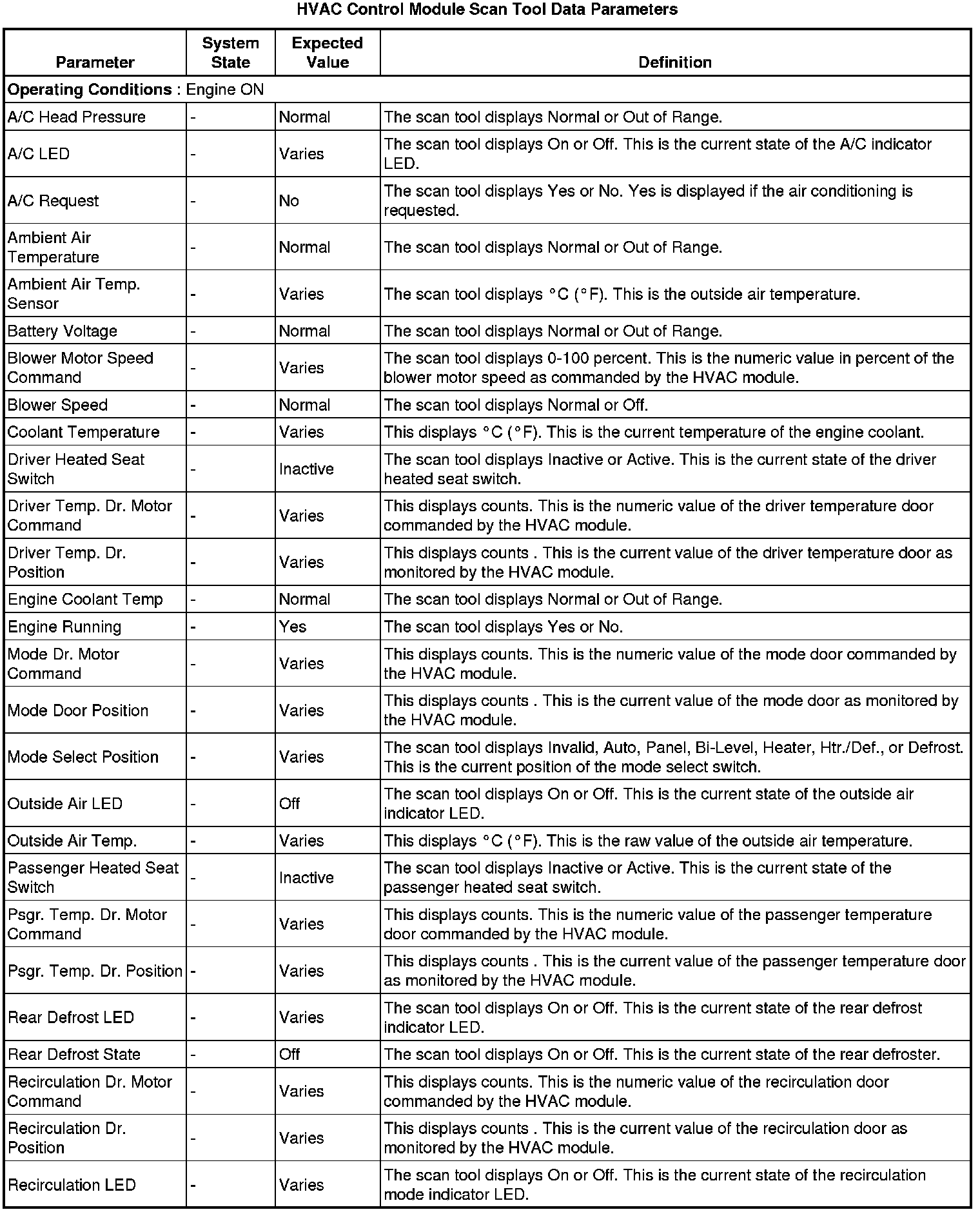 Heating, Ventilation and Air Conditioning Control Module Scan Tool Information