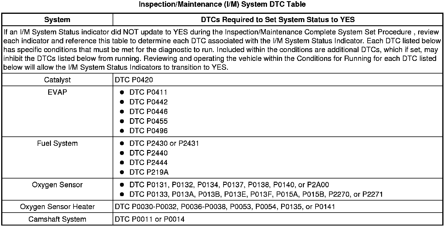 Inspection/Maintenance (I/M) System DTC Table