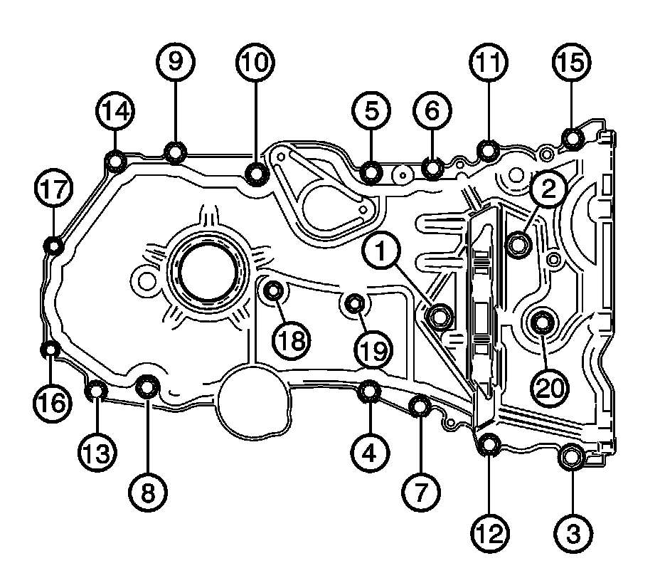 Tighten the engine front cover bolts in sequence to final torque twice: