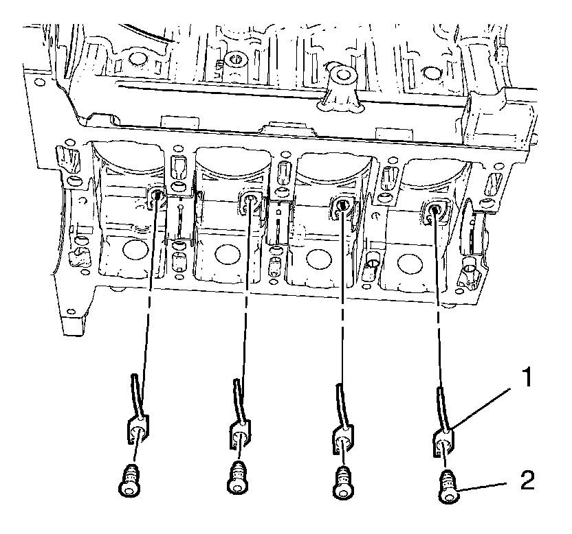 5. Remove the 4 piston oil nozzle bolts (2).