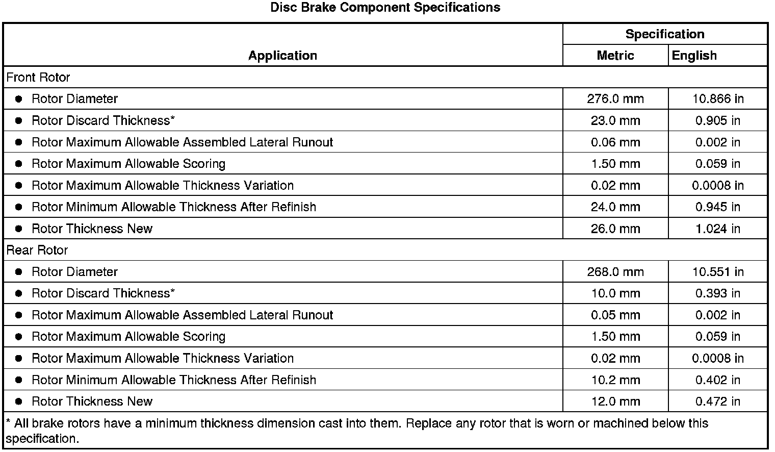Disc Brake Component Specifications
