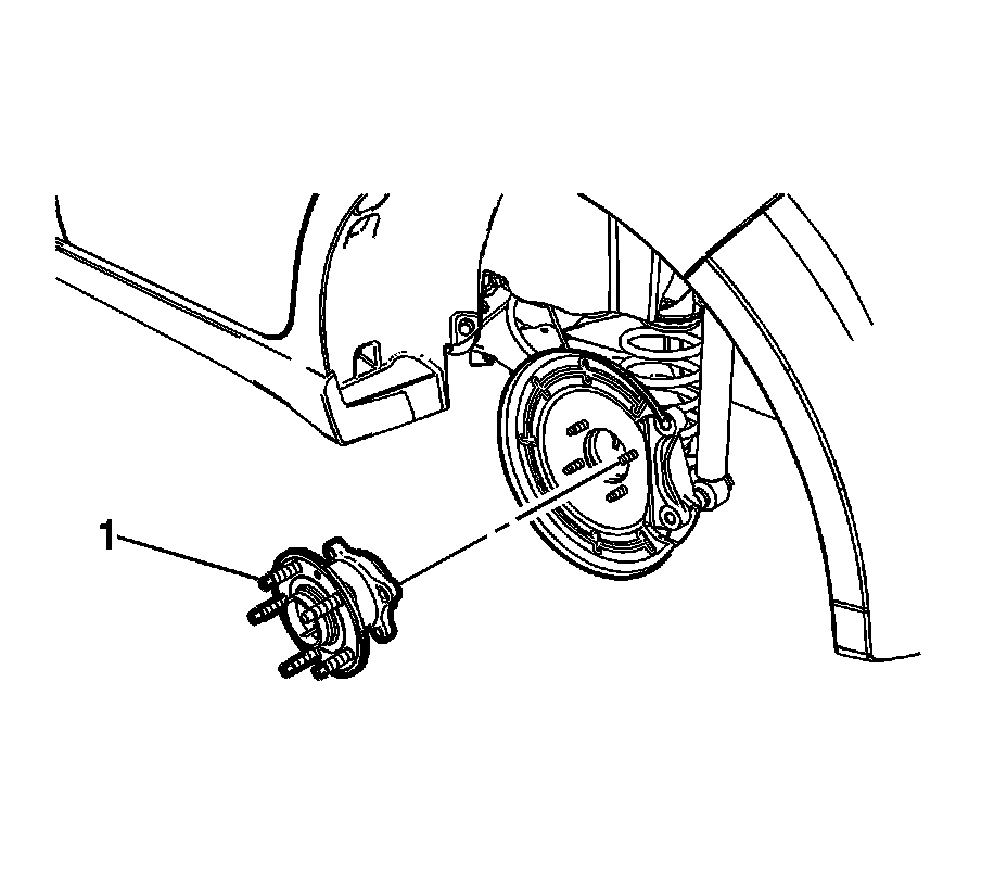 2. Install the rear wheel bearing and hub assembly (1). Refer to Rear Wheel Bearing and Hub Replacement Rear Suspension.