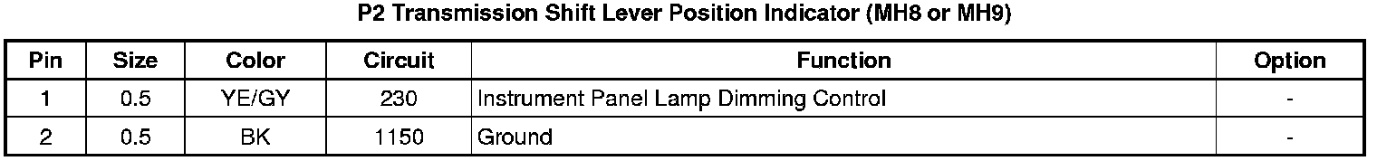 P2 Transmission Shift Lever Position Indicator (MH8 or MH9)