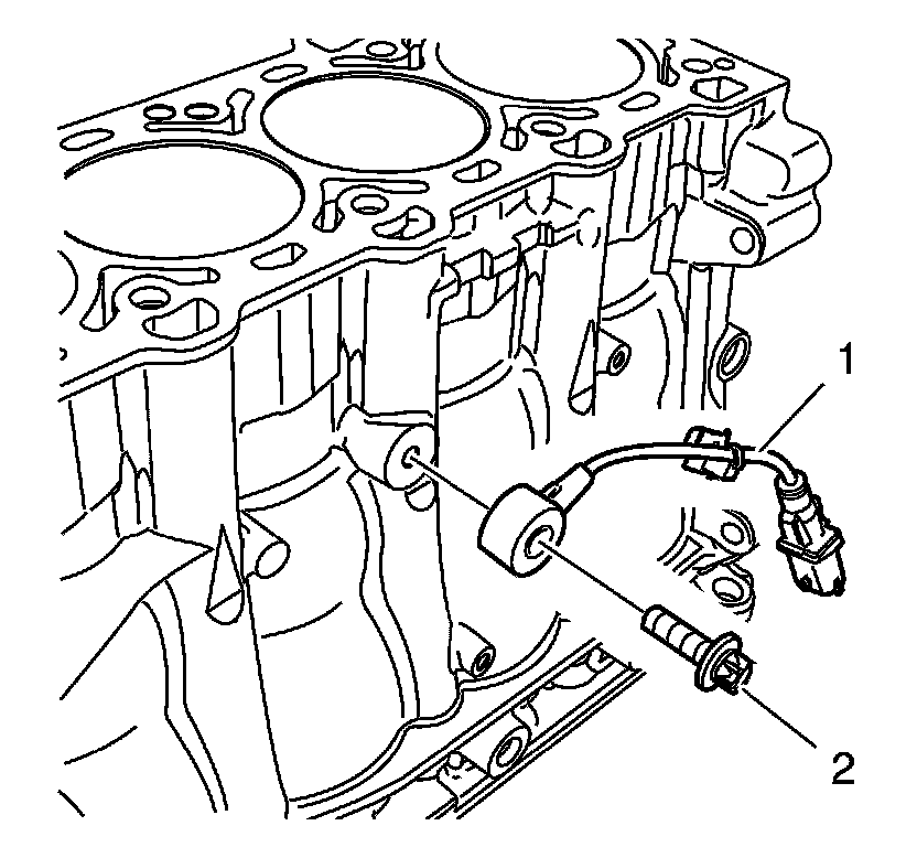 4. Install the knock sensor (1) and the knock sensor bolt (2) and tighten to 20 Nm (15 lb ft).
