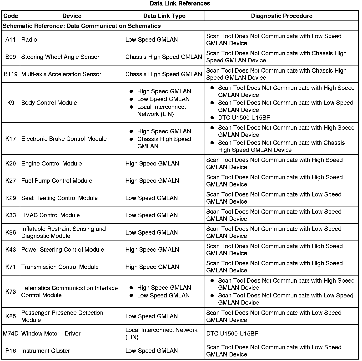 This table identifies which serial data link that a particular device uses for in-vehicle data transmission. Some devices may use more than one data link to communicate. Some devices may have multiple communication circuits passing through them without actively communicating on that data link. This table is used to assist in correcting a communication malfunction. Not all devices listed will be applicable to all vehicles. Refer to the schematics to determine which devices apply. For the description and operation of these serial data communication circuits, refer to Data Link Communications Description and Operation Description and Operation.