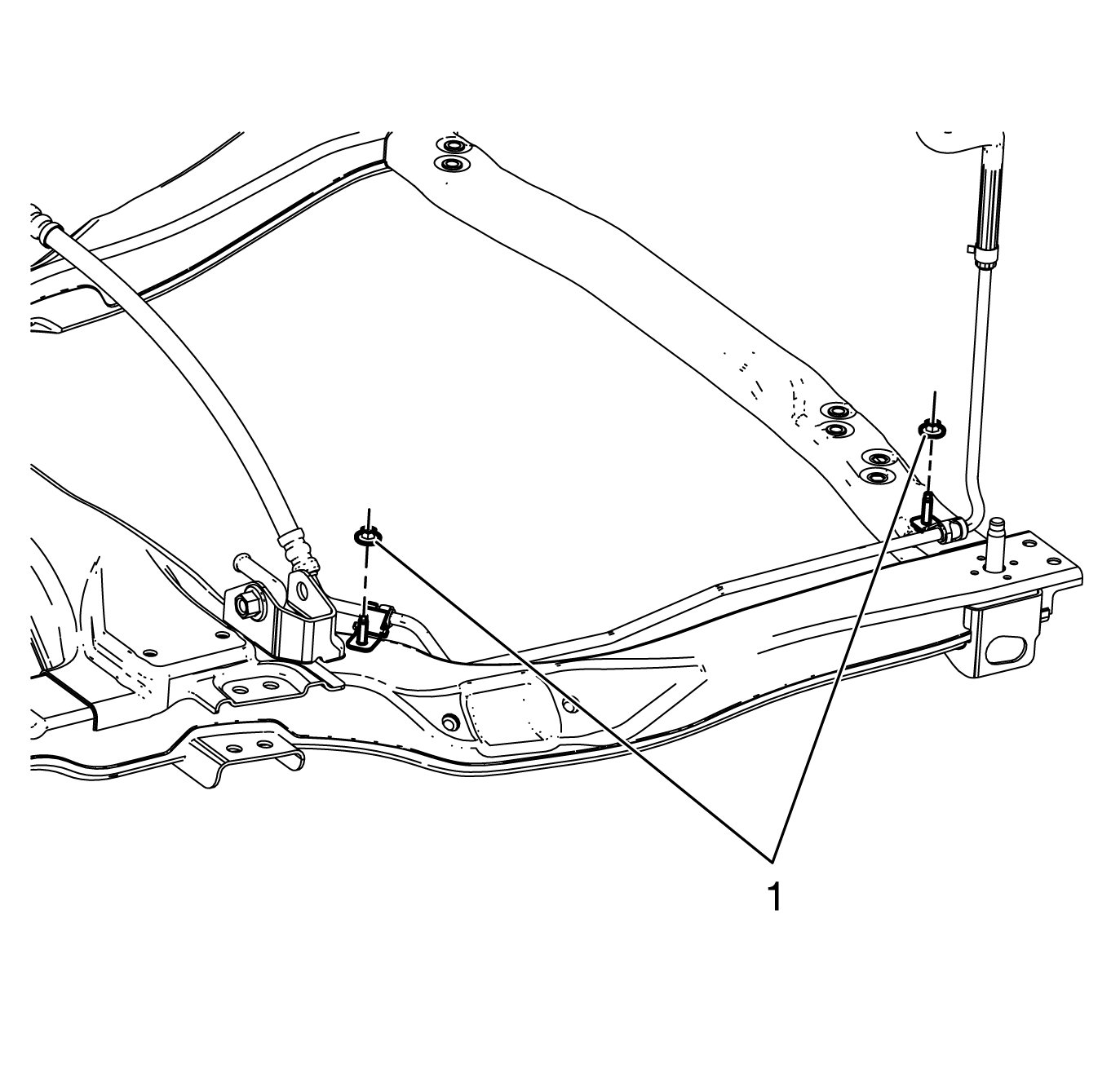 14.Remove the power steering pipe/hose retaining nuts (1) and separate the pipe from the frame. Refer to Power Steering Gear Outlet Pipe/Hose Replacement .