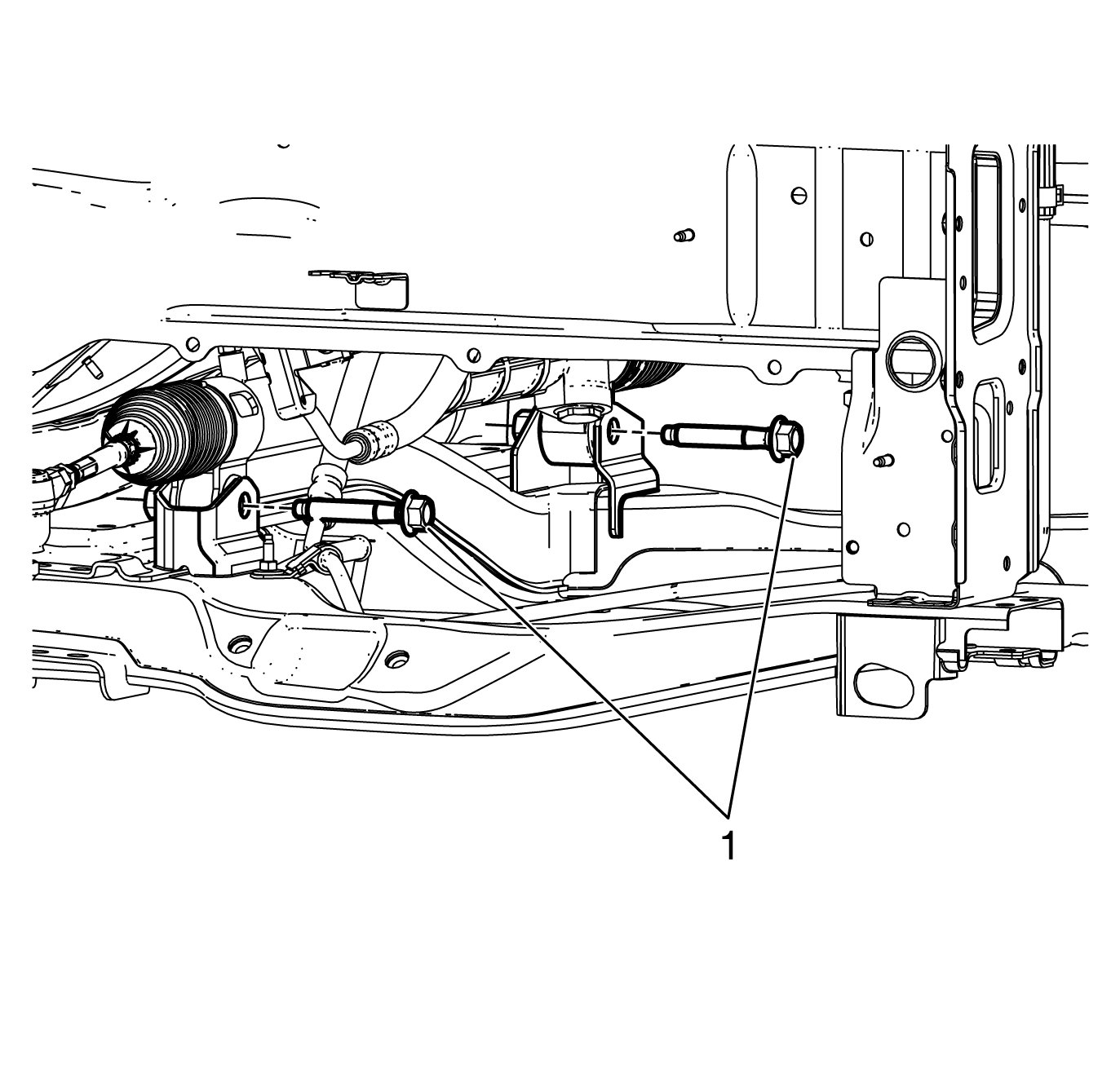 15.Remove the steering gear assembly to the frame retaining bolts (1) and separate the steering gear assembly from the frame. Refer to Steering Gear Replacement .