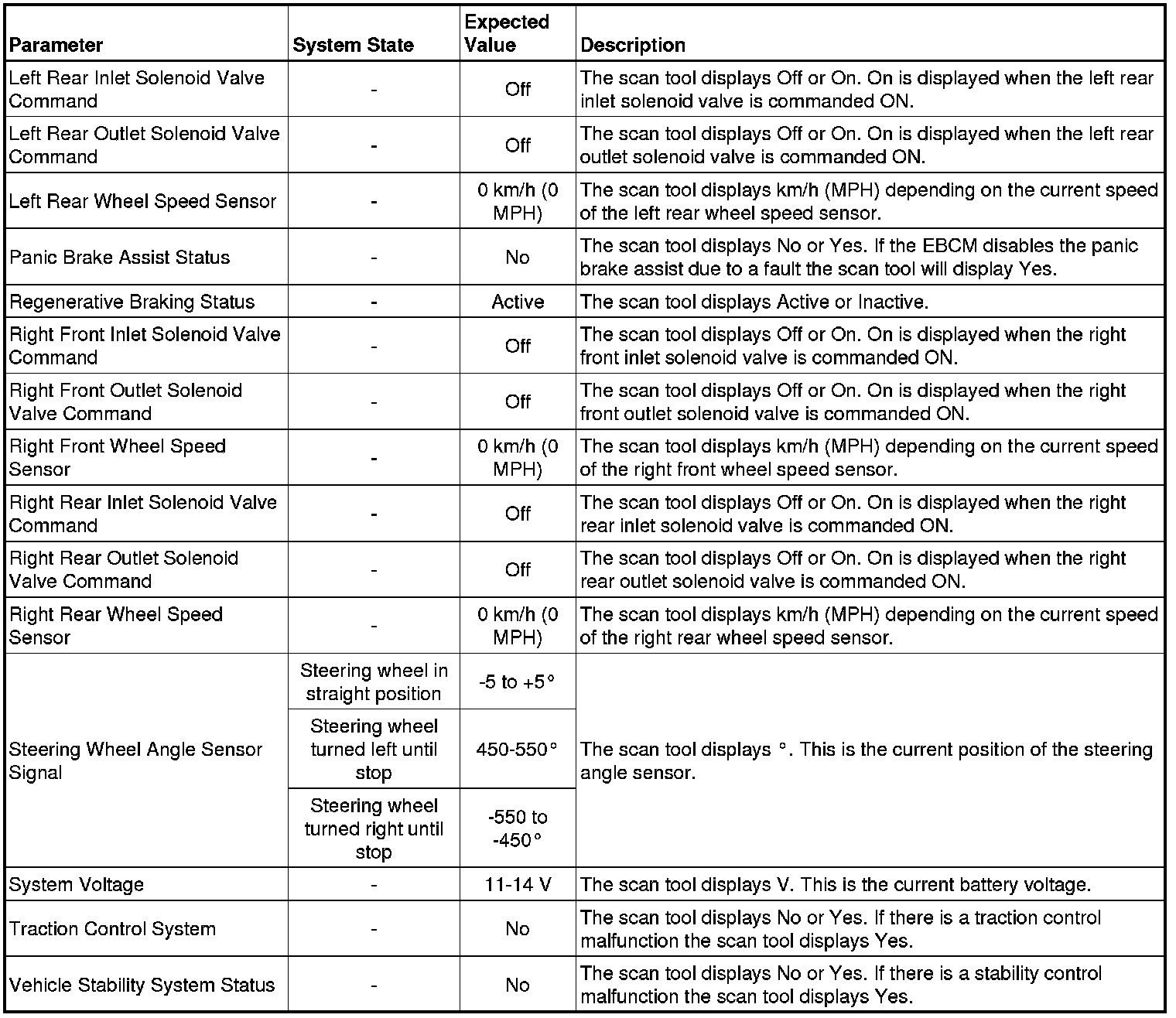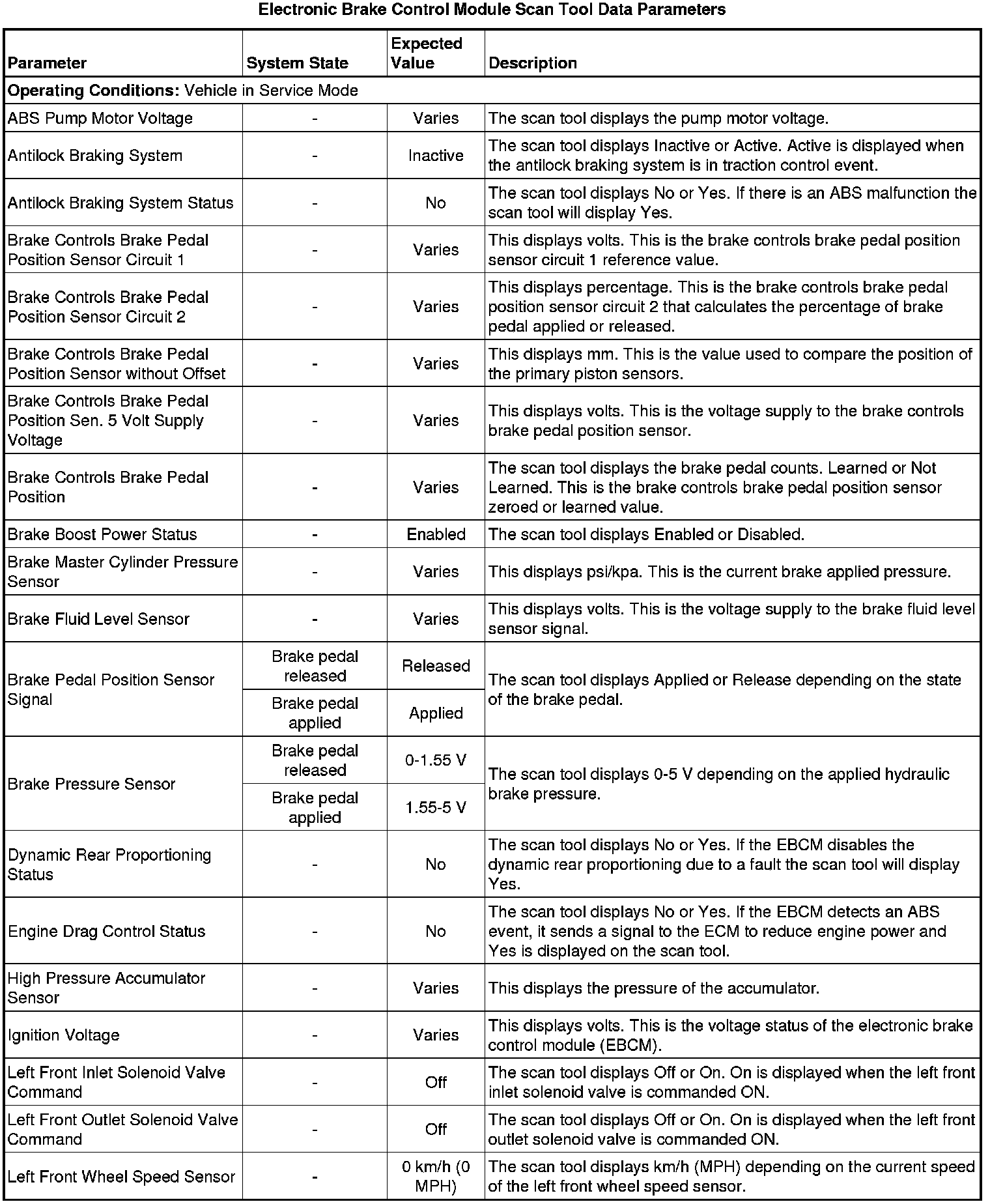 The electronic brake control module (EBCM) scan tool data parameters list contains all ABS related parameters that are available on the scan tool. The list is arranged in alphabetical order. A given parameter may appear in any one of the data lists.