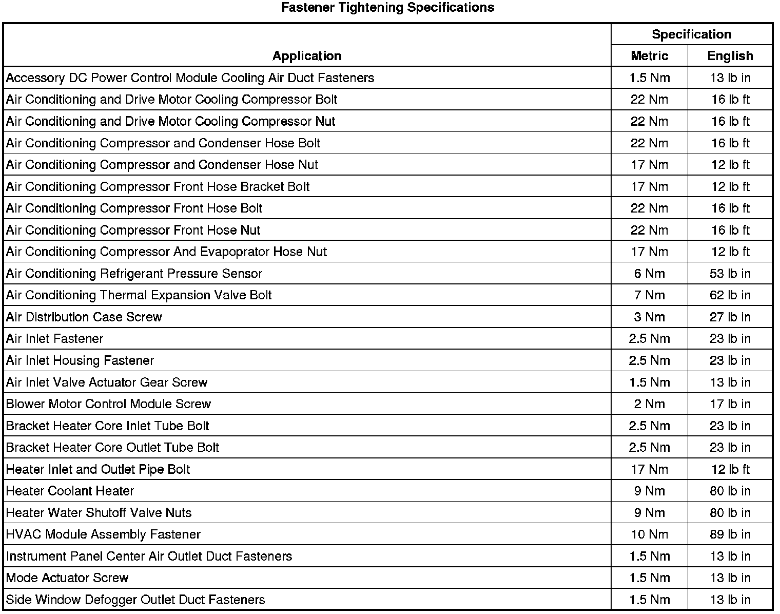 Fastener Tightening Specifications