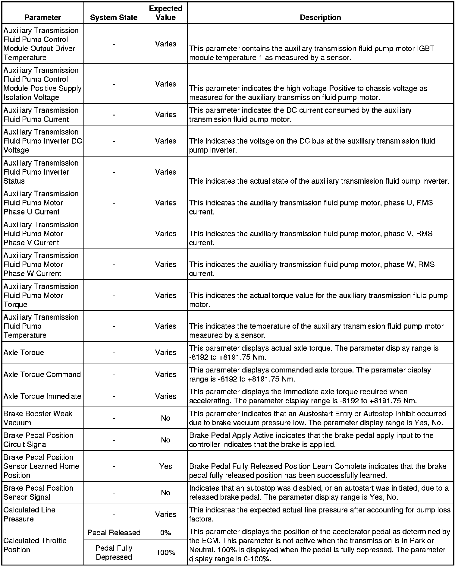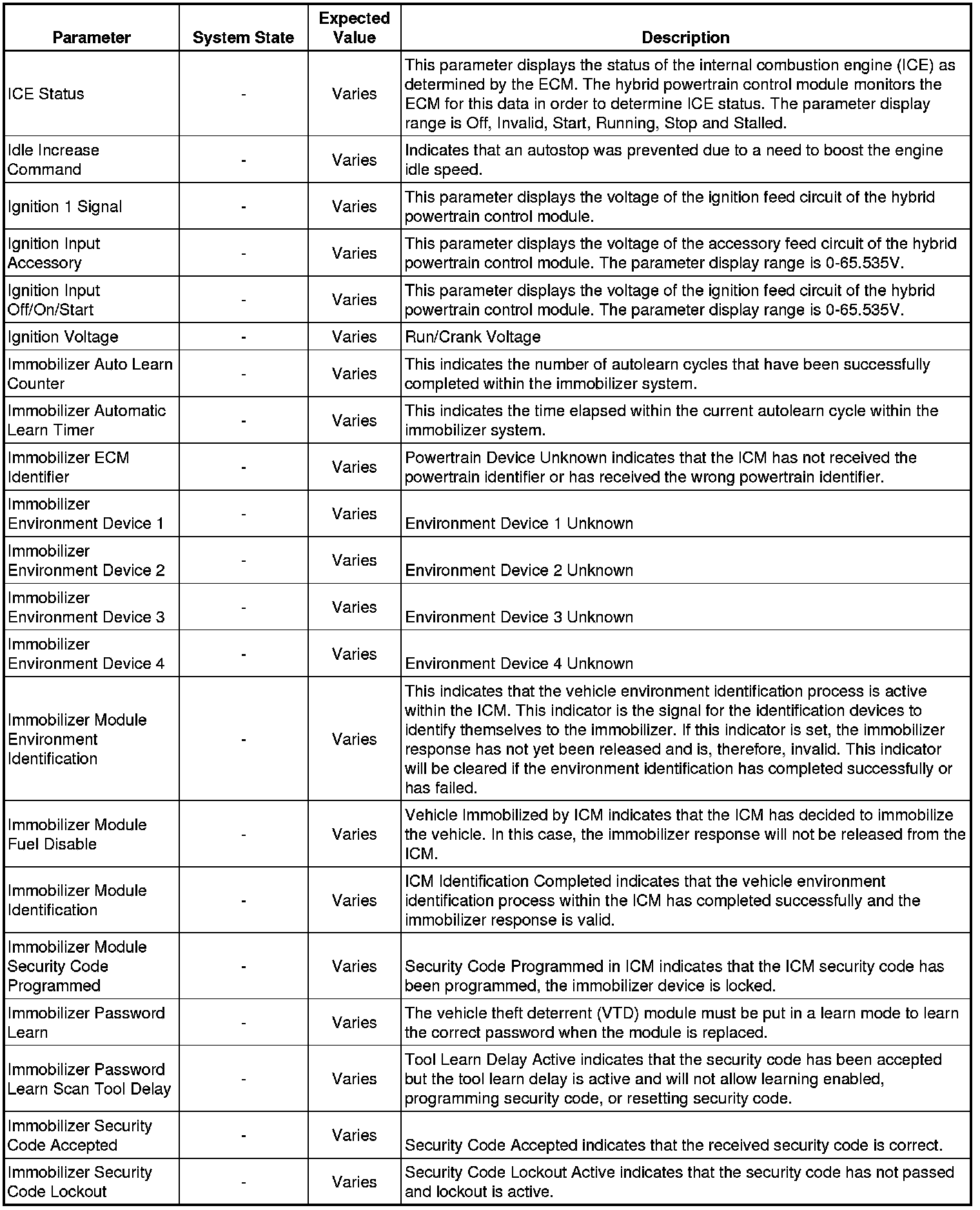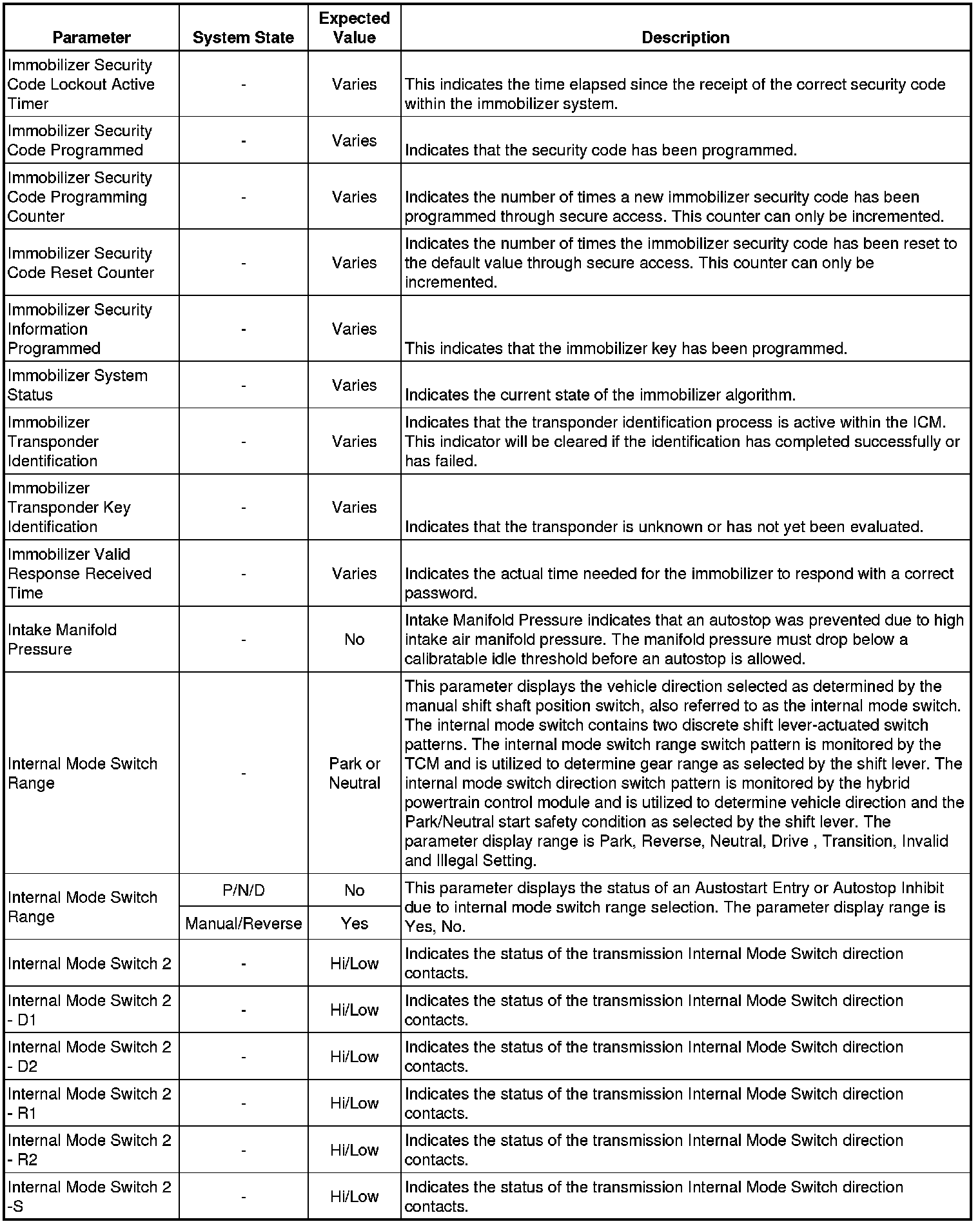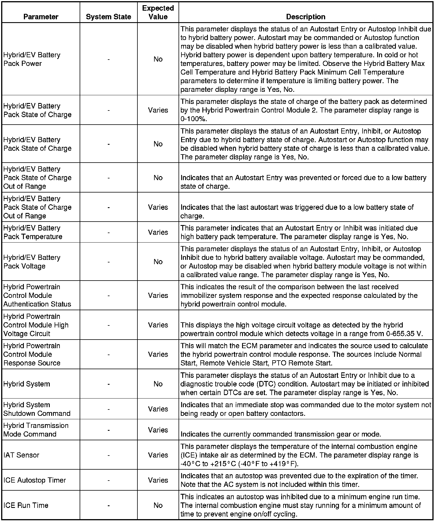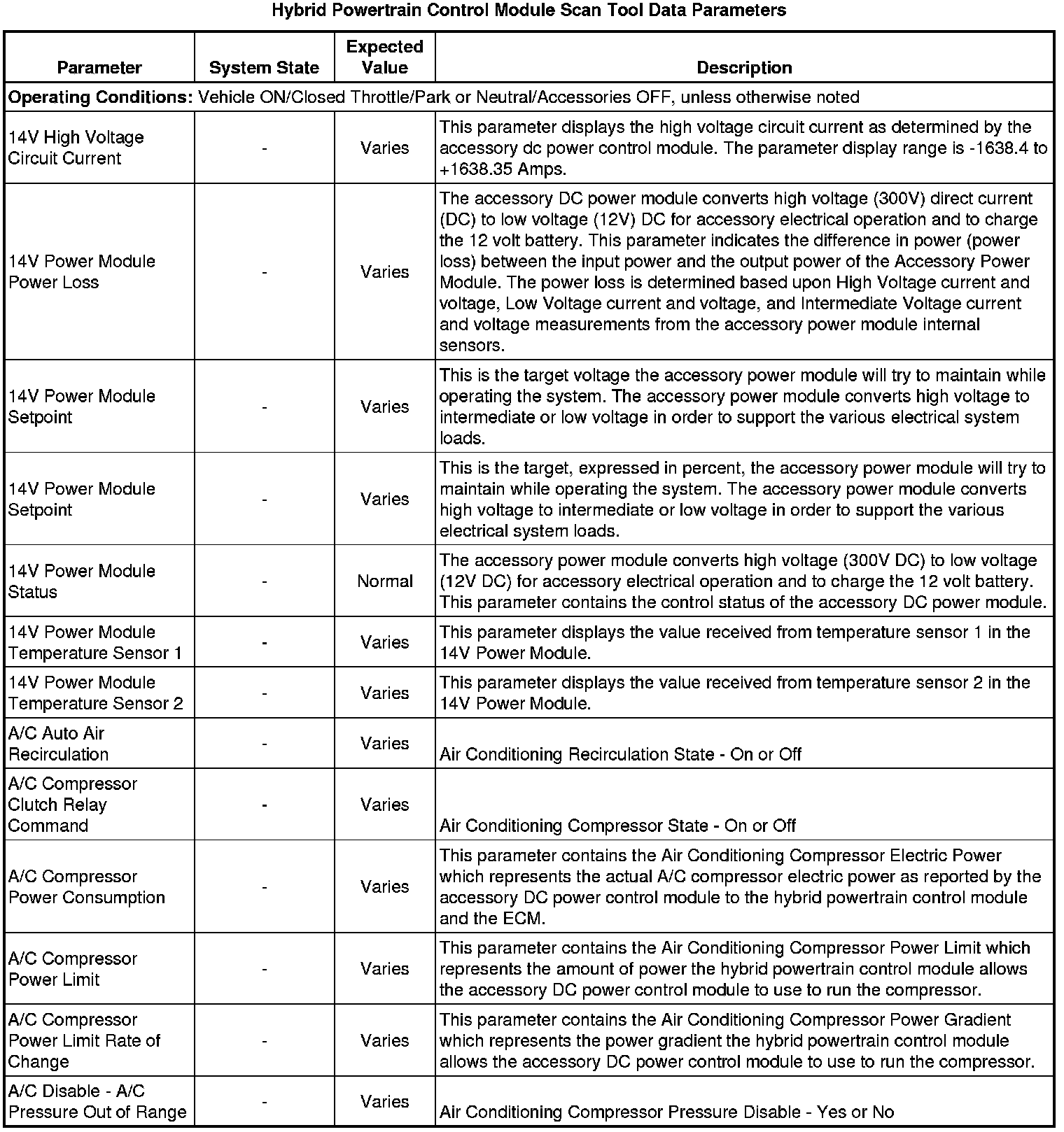 The scan tool values from a properly running vehicle may be used for comparison with the vehicle you are diagnosing. The Hybrid Powertrain Control Module Scan Tool Data Parameters list represents values that would be seen on a normally running vehicle.