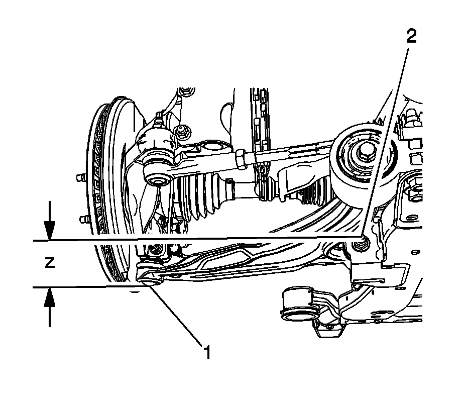 The Z Height: The vertical distance from the forward front lower control arm (2) attachment bolt tip to the center of the ball joint cup (1).