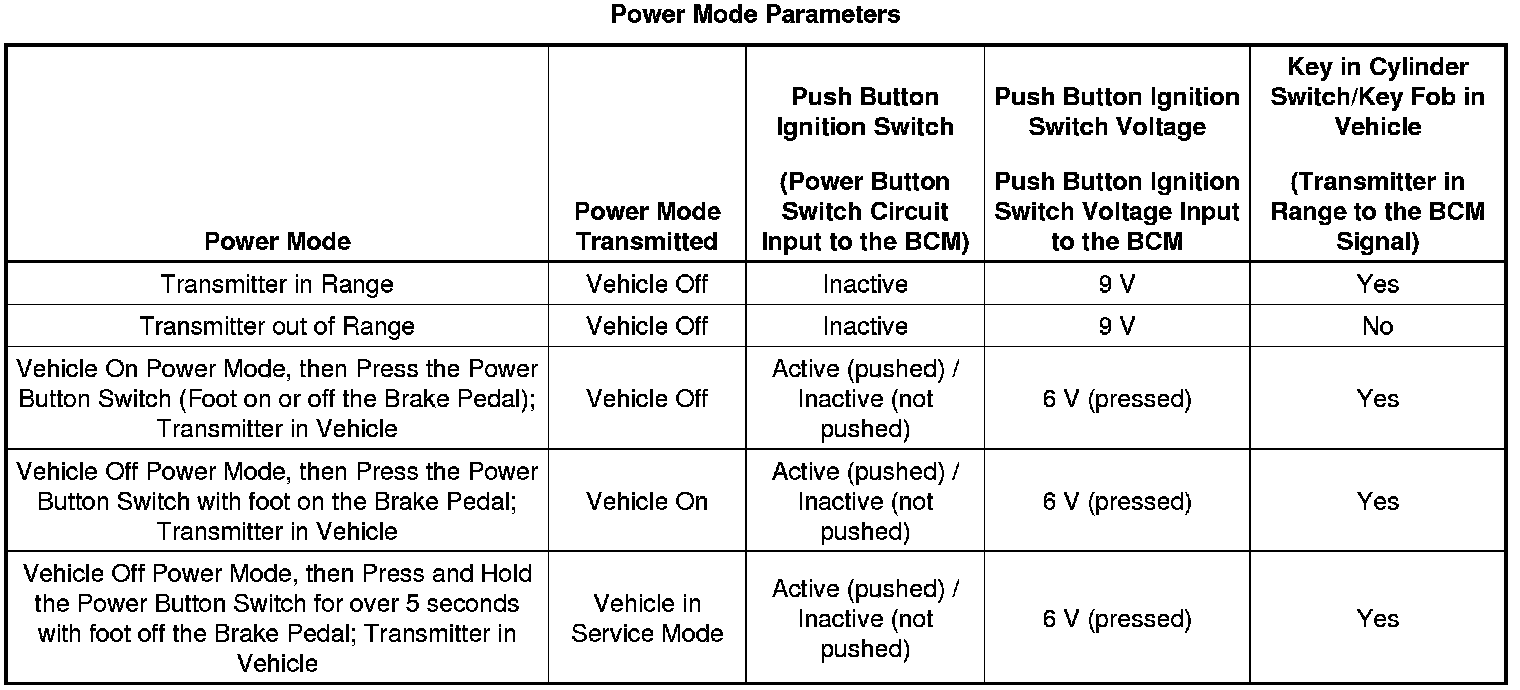 The power mode master receives power button switch signals and transmitter in range signals to identify the operators desired power mode. The Power Mode Parameters table below illustrates the correct state of these input parameters (circuits) in correspondence to the power button switch position and the transmitter to vehicle range: