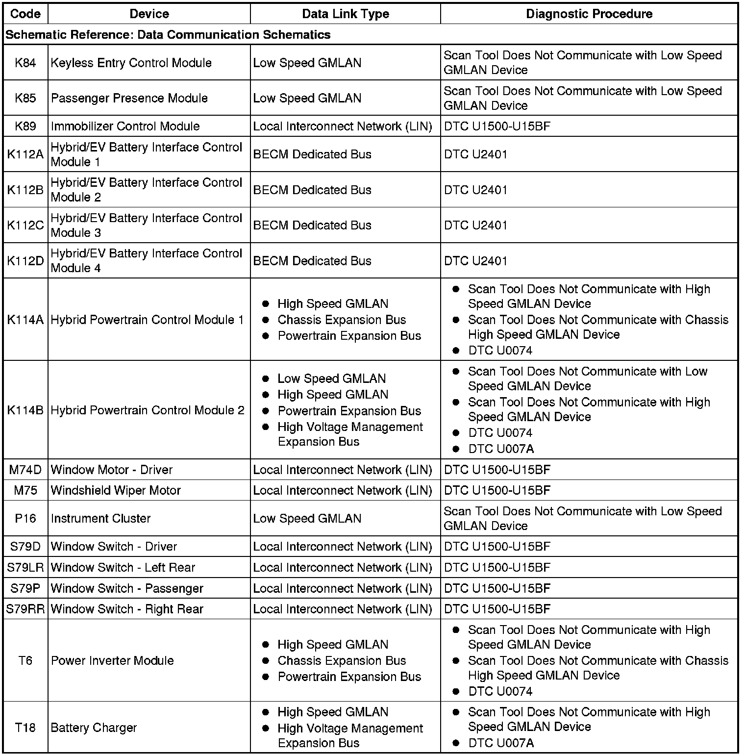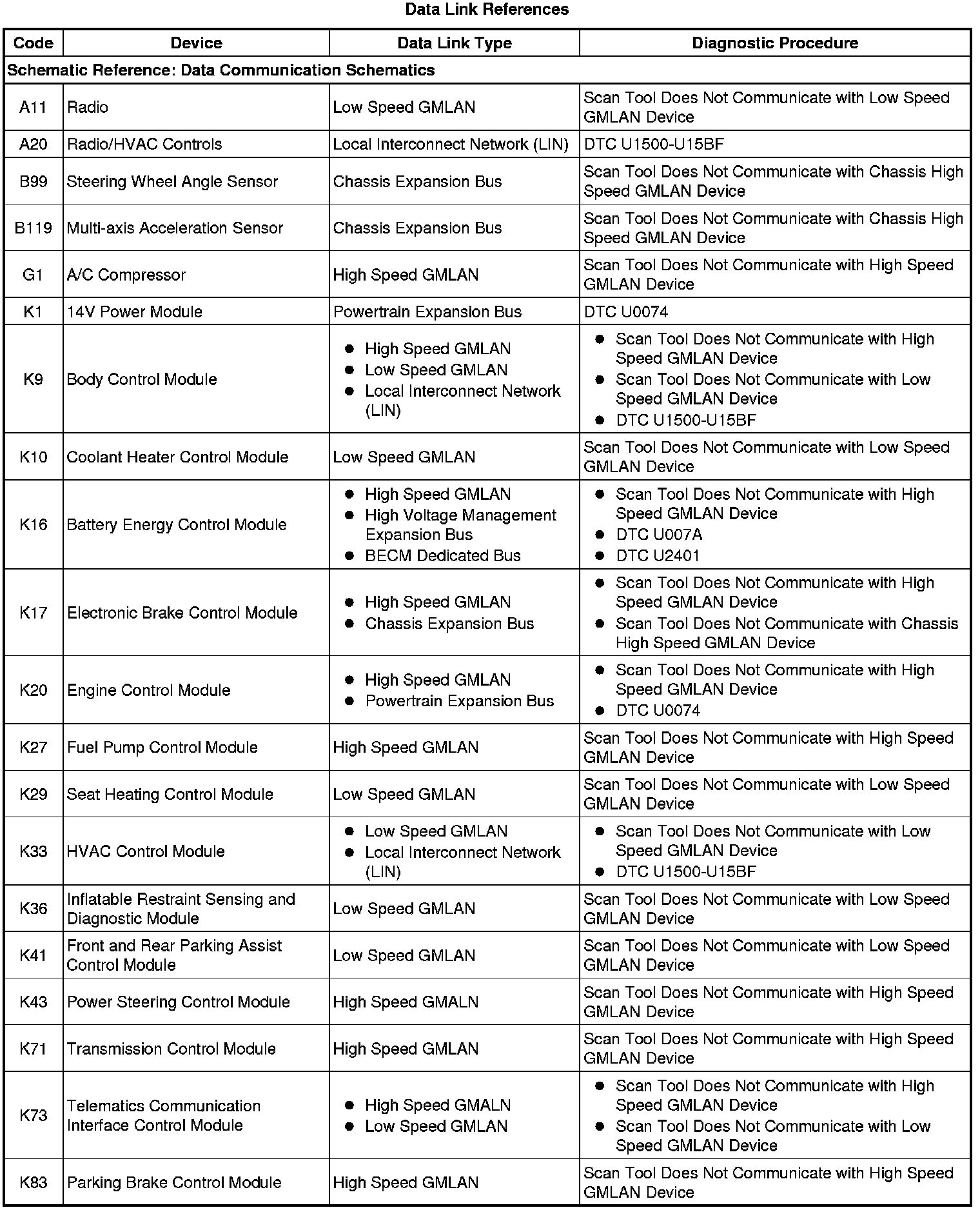 This table identifies which serial data link that a particular module uses for in-vehicle data transmission. Some modules may use more than one data link to communicate. Some modules may have multiple communication circuits passing through them without actively communicating on that data link. This table is used to assist in correcting a communication malfunction. For the description and operation of these serial data communication circuits refer to Data Link Communications Description and Operation Description and Operation.