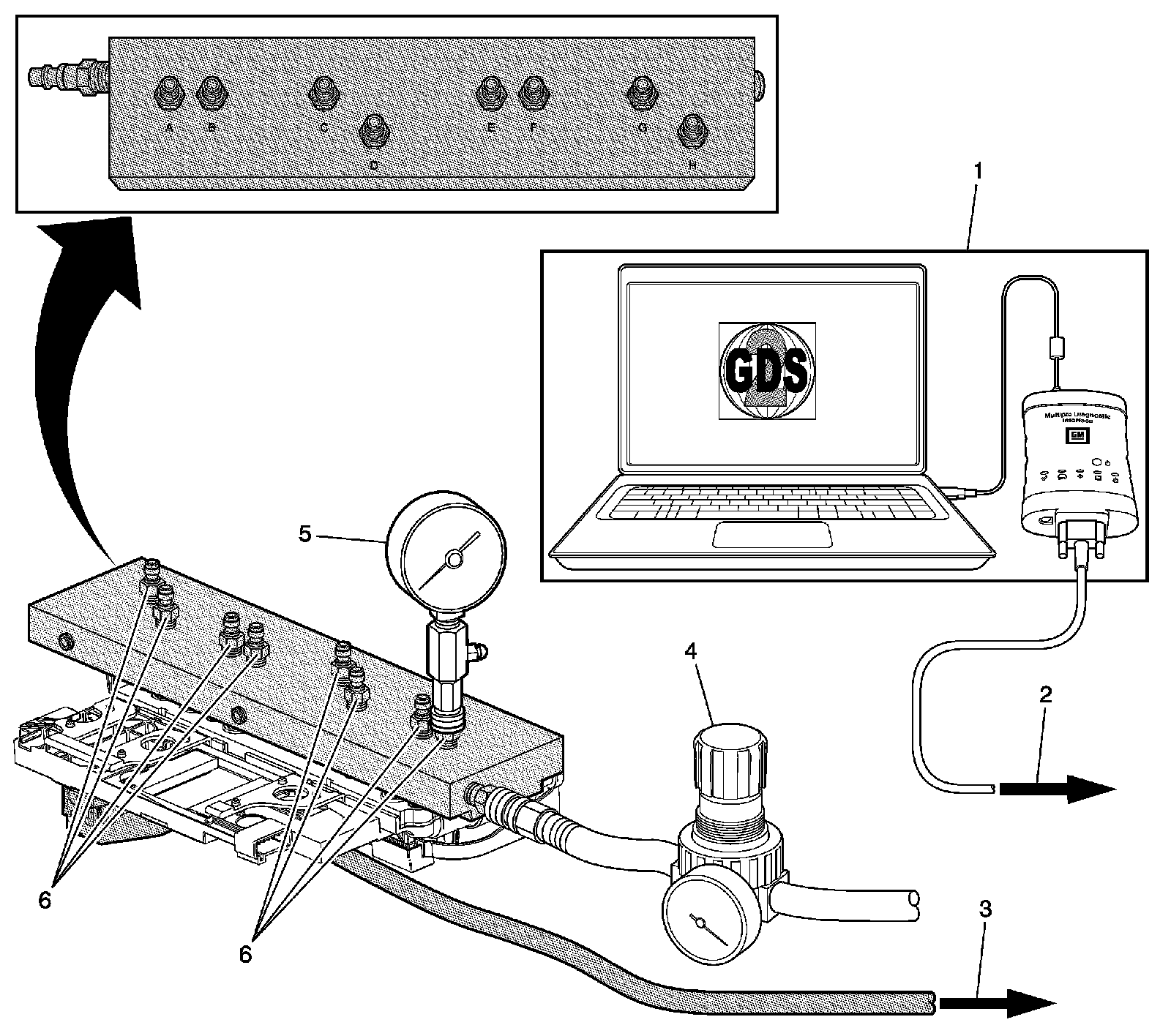 6. Cover the DT-47825 - test block ports (6) with a shop towel. Transmission fluid may exit these ports when the solenoids are commanded ON.