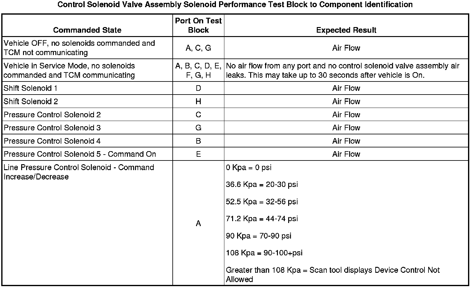 The purpose of this procedure is to test the functionality of the control solenoid valve assembly solenoids for a stuck open or stuck closed condition, or a faulty transmission fluid pressure switch. DT-47825 - test block is bolted to the control solenoid valve assembly on the valve body mounting surface. Pressurized air is passed into the aluminum test block, through the control solenoid valve assembly solenoid passage and back to the outlet port on the test block. A scan tool is used to command the solenoids ON and OFF. While observing the airflow, one can determine the valve functionality. The recommended shop air pressure for this test is regulated to 90-100 psi.