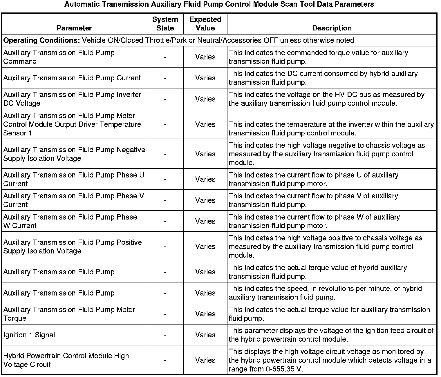 The scan tool values from a properly running vehicle may be used for comparison with the vehicle you are diagnosing. The Automatic Transmission Auxiliary Fluid Pump Control Module Scan Tool Data Parameters list represents values that would be seen on a normally running vehicle.