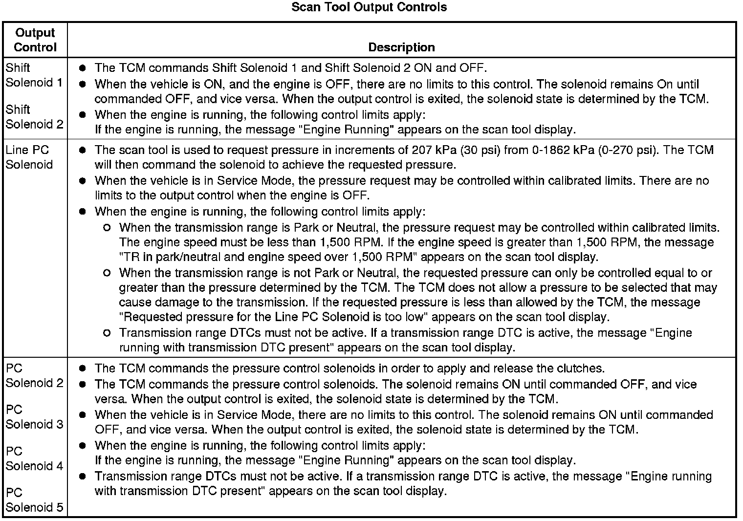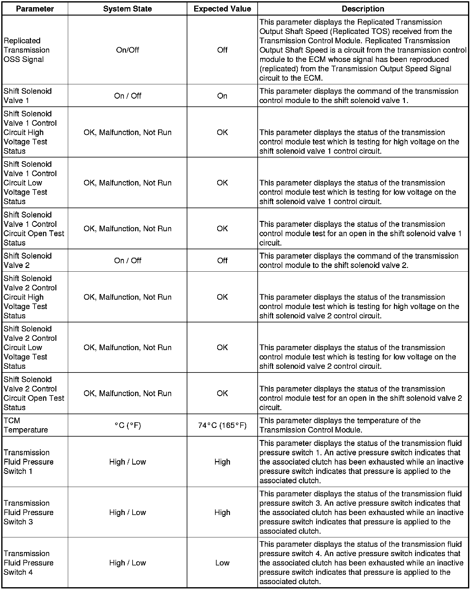 The Transmission Control Module Scan Tool Data List contains all transmission related parameters that are available on the scan tool. The list is arranged in alphabetical order. A given parameter may appear in any one of the data lists, and in some cases may appear more than once, or in more than one data list in order to group certain related parameters together.