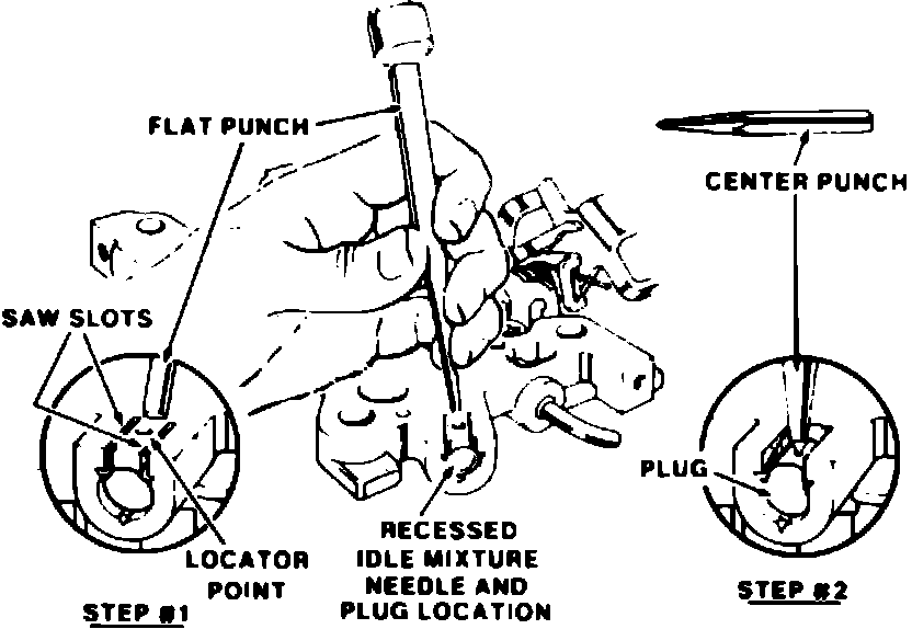 2. Using a suitable hacksaw blade, make two parallel cuts on each side of locator point in throttle body, below idle mixture needle plug, Fig. 17. The cuts should extend down to steel plug, but not more than 1/8 inch beyond locator point. The distance between saw cuts depends on size of punch used.